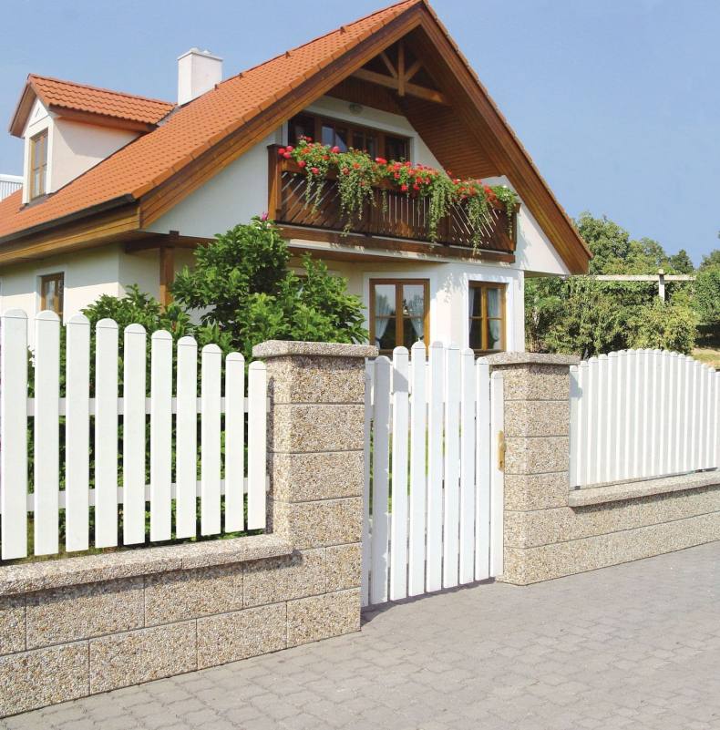 Например, белый штакетник в сочетании со столбами из силикатного кирпича выглядит довольно тускло.
