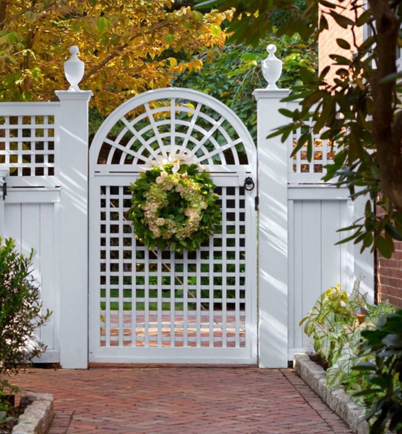 Даже самая простая и дешевая белая ограда выглядит роскошно и элегантно. Интересно смотрится сочетание темных столбов со светлой решеткой.