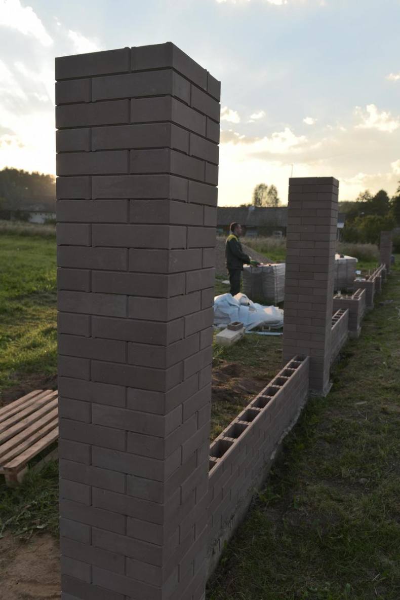 - Выполнить кладку с перевязкой швов. Кладку выполнить аналогично кирпичной. При необходимости сделать облицовку забора.