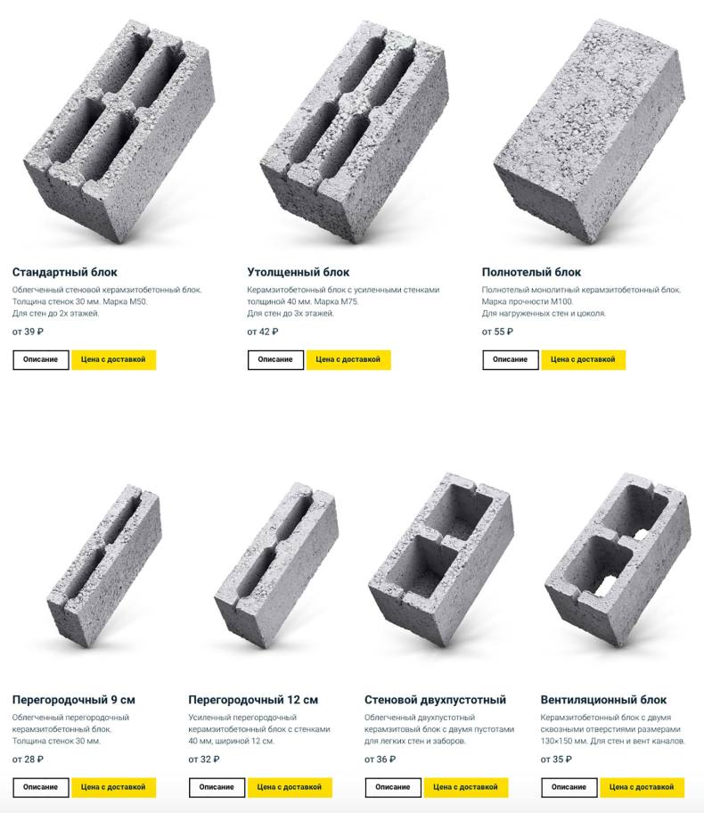 Блоки могут быть полые или с наполнителем в виде шлака, отсева, щебня, керамзита, гравия, боя кирпича. Блоки делятся на:
