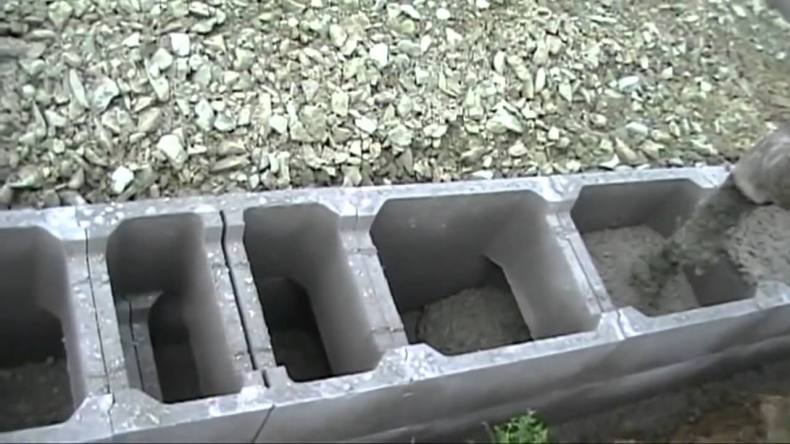 - Ровным слоем выложить цементный раствор, на который необходимо уложить ряд обычных бетонных блоков.
