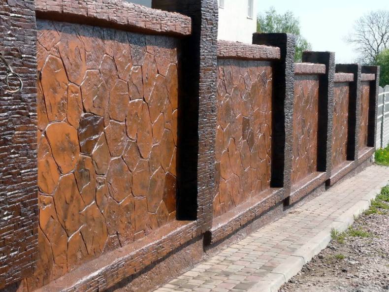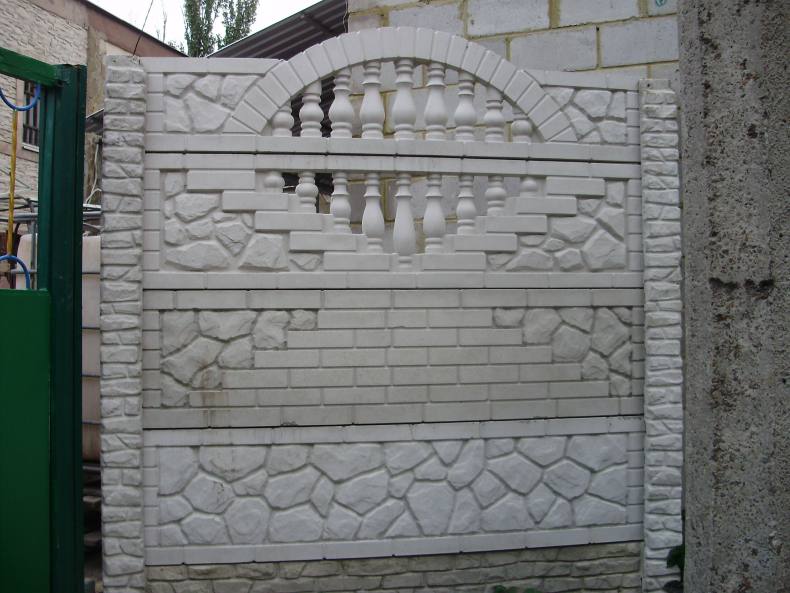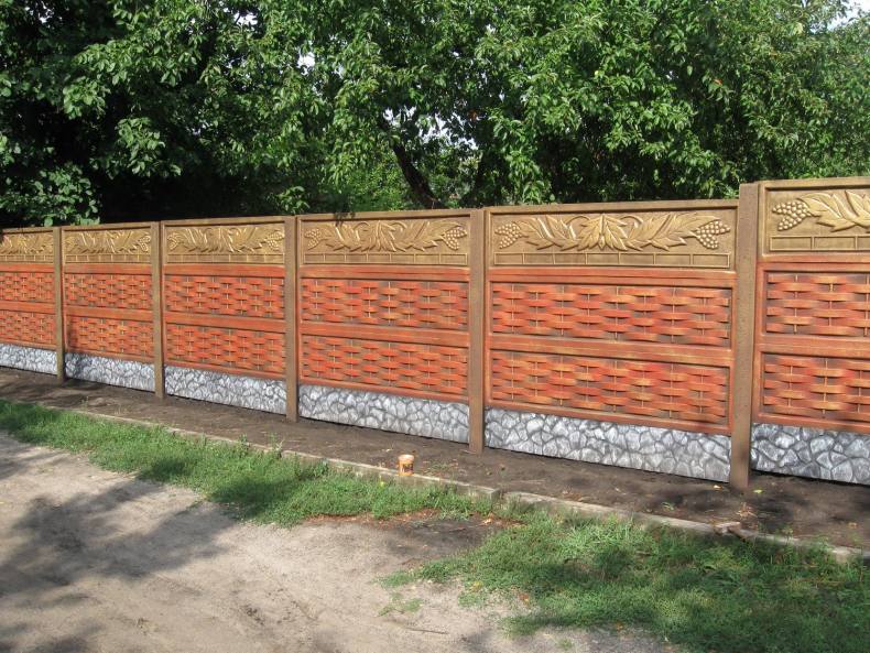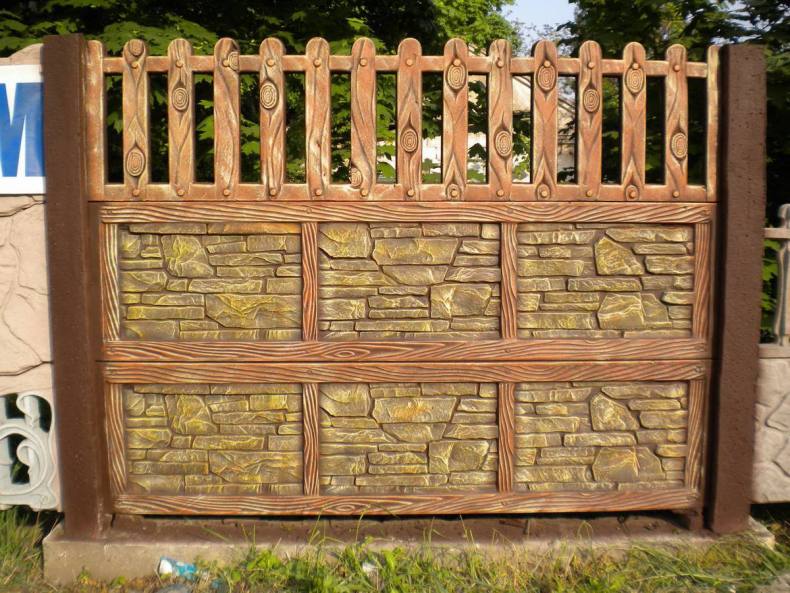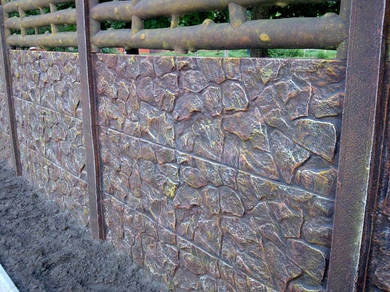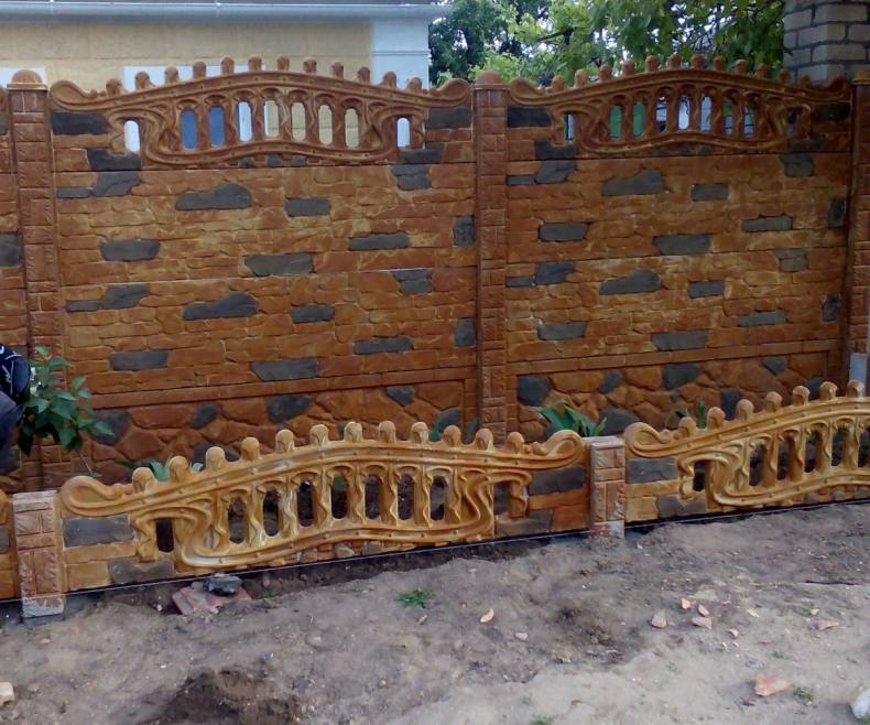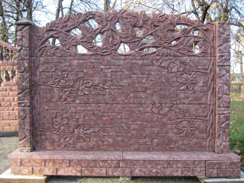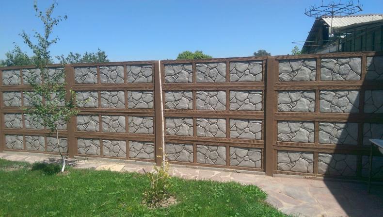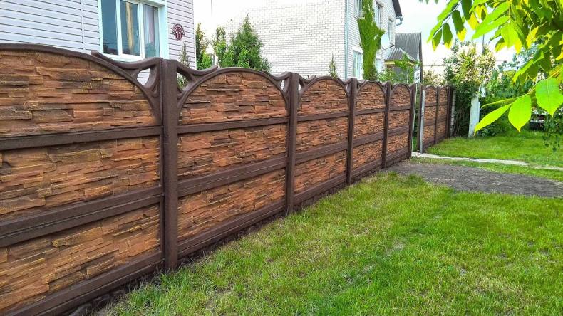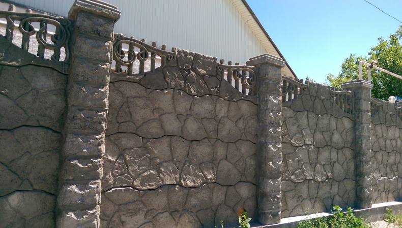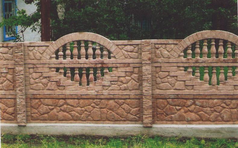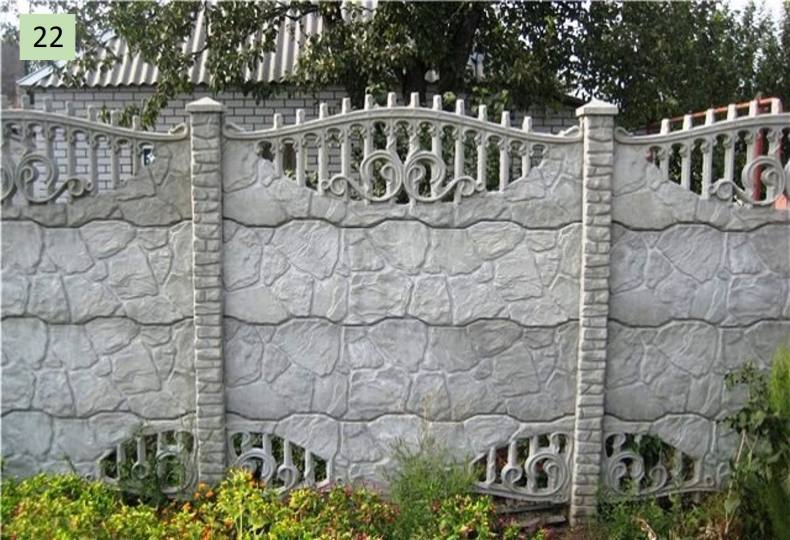 - Наборные ограждения. Это сооружение из бетонных секций с декоративными вставками в верхней части. Текстура бетона может имитировать камень, дерево или другие природные ресурсы.