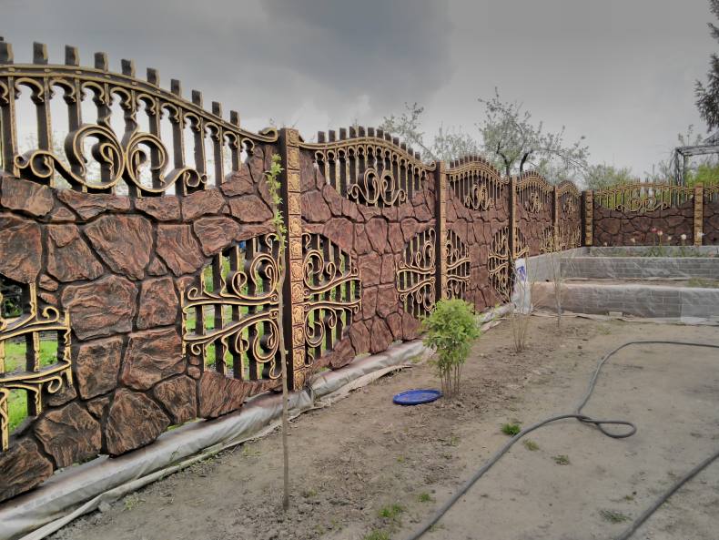 При монтаже чаще всего применяются бетонные пустотелые блоки. Обычно еврозаборы дополняют коваными элементами, чтобы сделать их выше и эстетичнее.