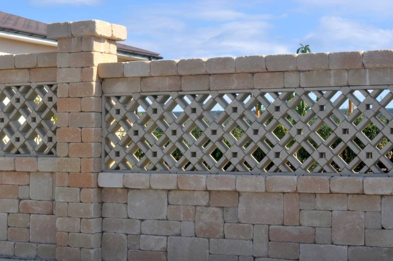 - Блочные заборы. Соединяются из бетонных блоков, которые фиксируются между собой цементной смесью. Используются пустотелые бетонные блоки, для отделки которых потребуется штукатурка. Перед монтажом забора желательно установить основание. Опорные столбы в данном типе ограждения не нужны. С виду конструкция смотрится как стена с довольно крупными кирпичами.