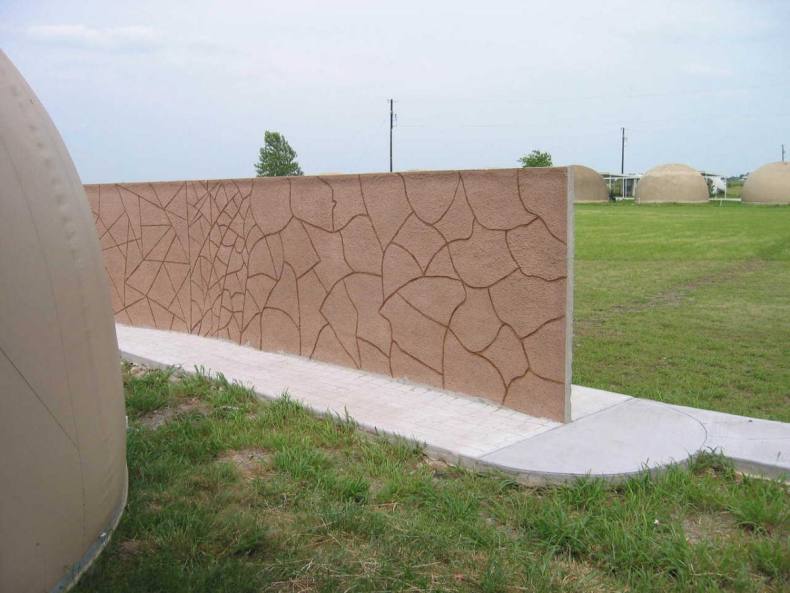 - Монолитные конструкции. Являются одними из самых крепких строений, основываются на ленточном или столбчатом фундаменте. Владельцы придомовых территорий часто окрашивают плиты, для технических зданий часто используются стандартные плиты.