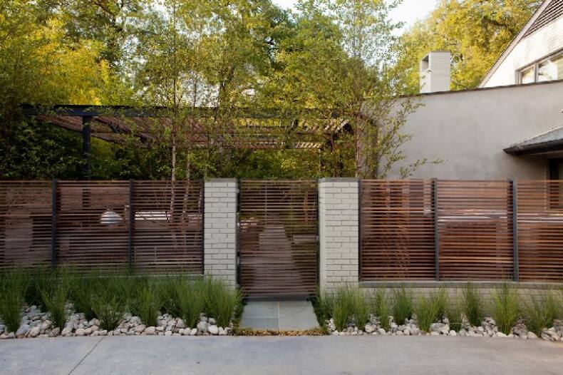 На вопрос, что лучше посадить вдоль деревянного забора, можно ответить однозначно – деревья или кустарники, которые не будут оплетать его. Он не должен мокнуть под слоем зелени лиан. В компании забора из дерева хорошо смотрятся стильные хвойные и самшиты.