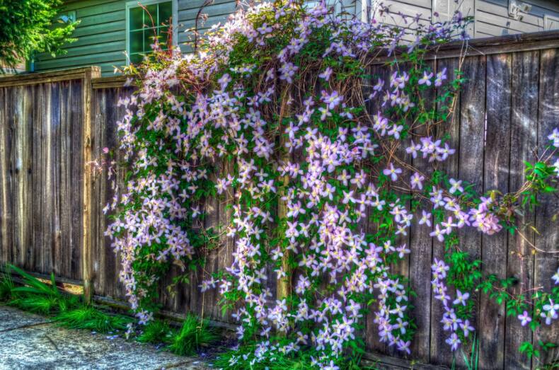 Вряд ли кто-либо решится вырастить клематис снаружи, так как захочет смотреть на такую красоту сам, на внутренней стороне забора. Это цветущая лиана, которая вполне может радовать глаз десяток лет. Другое ее название – ломонос, диаметр цветов достигает 25 см. При покупке сорта необходимо уточнить информацию о возможностях роста, морозостойкости и периоде цветения. Обычно ломонос цветет с мая до глубокой осени. Чтобы быстро закрыть ограду, используют ломонос виноградолистный, который дает побеги до 10 м за несколько месяцев. Но его цветки мельче, как правило, белые. В тени цветения можно не ждать.