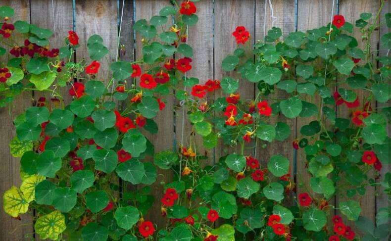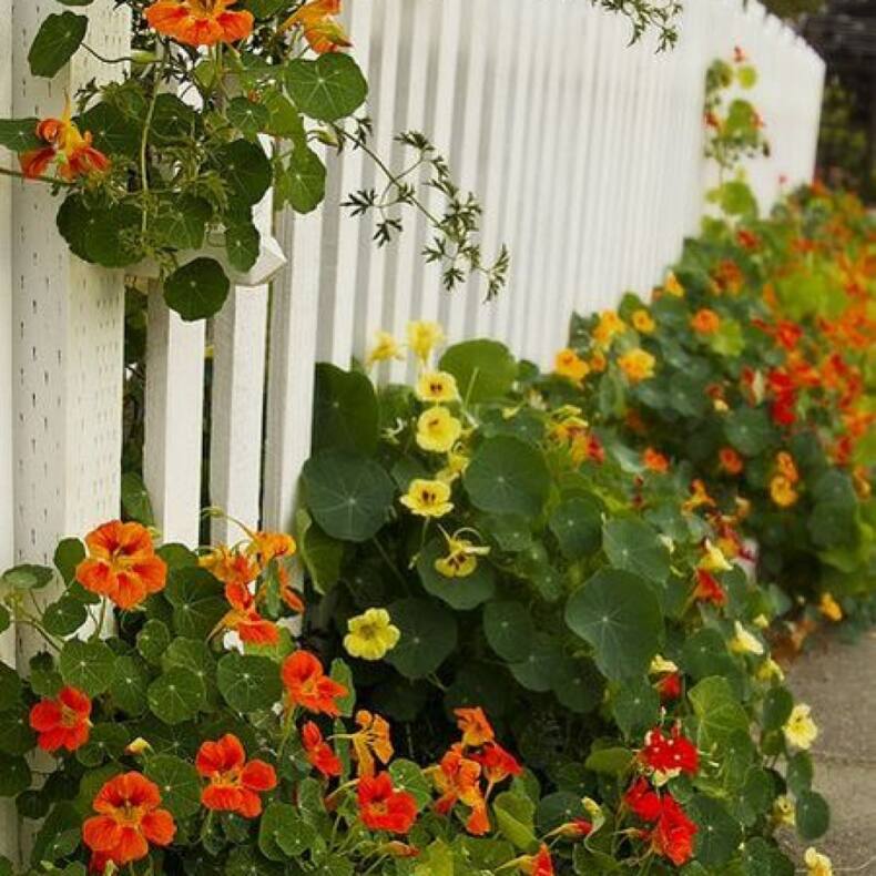 Вряд ли получится создать высокую изгородь при помощи настурции. Растения легко размножаются семенами весной и являются однолетними. Также можно попробовать разместить цветочные вазоны на разной высоте вдоль забора, и тогда получится закрыть его целиком на летний период. Земля для настурции не должна быть тяжелой, высаженные растения быстро растут и радуют глаз желтыми, красными или оранжевыми узнаваемыми цветками. Этим цветущим крохам обязательно требуется полив жарким летом, а также подкормка.