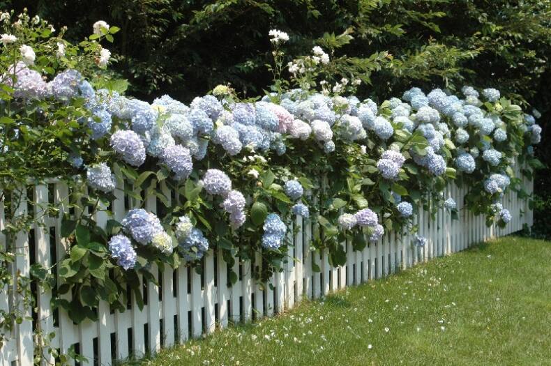 Гортензия, она же гидрангея – низкорослый кустарник для тех, кто не желает закрывать вид. Но речь в данном случае идет о распространенной гортензии крупнолистной. А вот гортензия черешковая – это лиана, которая вполне может закрыть собой не только забор, но даже стену дома. Усыпанное белыми цветками растение предпочитает кислый тип грунта с достаточной влажностью. Для этих целей почву под ней можно мульчировать, а для образования цветков нужно своевременно вносить удобрения. Сажают в грунт ее весной, на зиму производят укрывание.