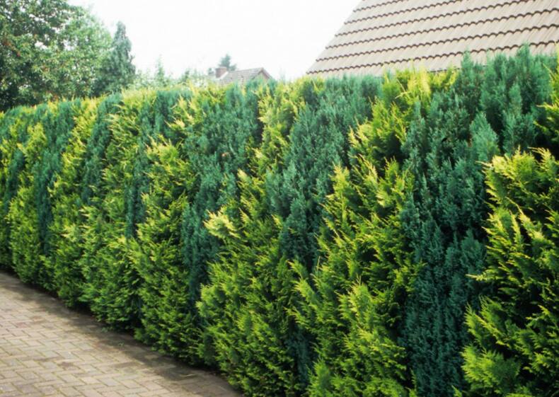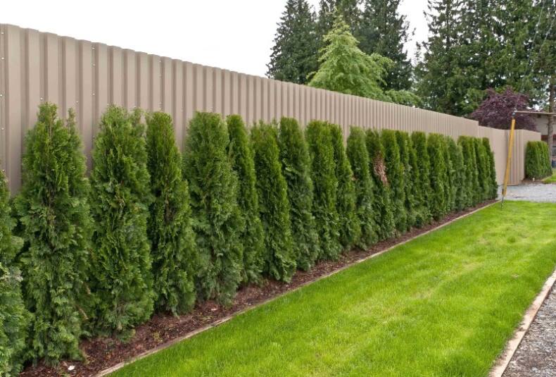 У туи тоже есть сорта небольшого роста: от кустарника до образцов для альпийской горки. Высокорослые же образцы вполне могут через несколько лет закрыть собой высокий деревянный забор, не оставив и щели. Если только у них не пирамидальный тип кроны. Это вечнозеленое дерево, которому понадобится особый уход в первые годы жизни. Притенение и едва ли не ежедневный полив в теплое время года, защита от собак. Весной туя требует специального укрытия, иначе получит солнечный ожог, и хвоя порыжеет. Зимой деревце необходимо защитить от большого количества снега деревянными щитами. Его нельзя перекармливать, рекомендованы специализированные удобрения.
