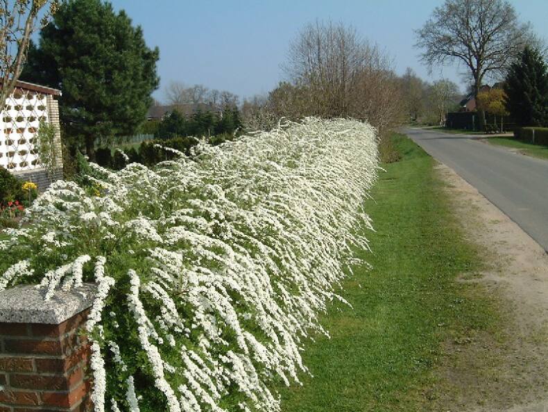 Многие узнают спирею японскую – кустарник с длинными, поникающими белыми соцветиями. Более высокорослый вариант – спирея иволистная с прямыми стеблями и розовыми соцветиями. Иволистная хорошо переносит засушливое лето, а вот японской придется увлажнять почву. Все растения морозостойкие, предпочитают светлые участки для хорошего цветения. В целом они неприхотливые, не требуют укрытия на зиму и подойдут даже новичкам.