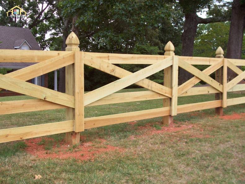 - Ограждению можно придать стиль кантри. Для этого забор делают вертикальным, а досочки к опорам прибивают еще и крест-накрест.