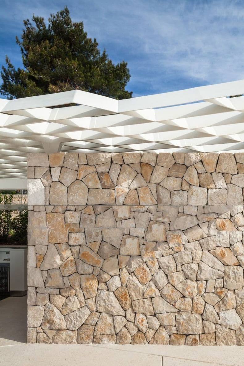 - Кирпичные опоры можно облицевать декоративным камнем. На колонны можно установить украшающие колпаки.