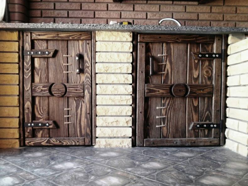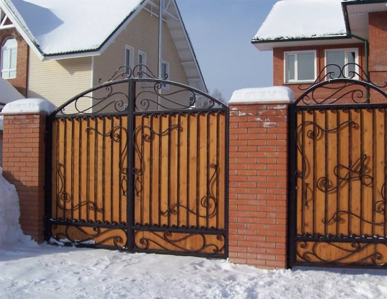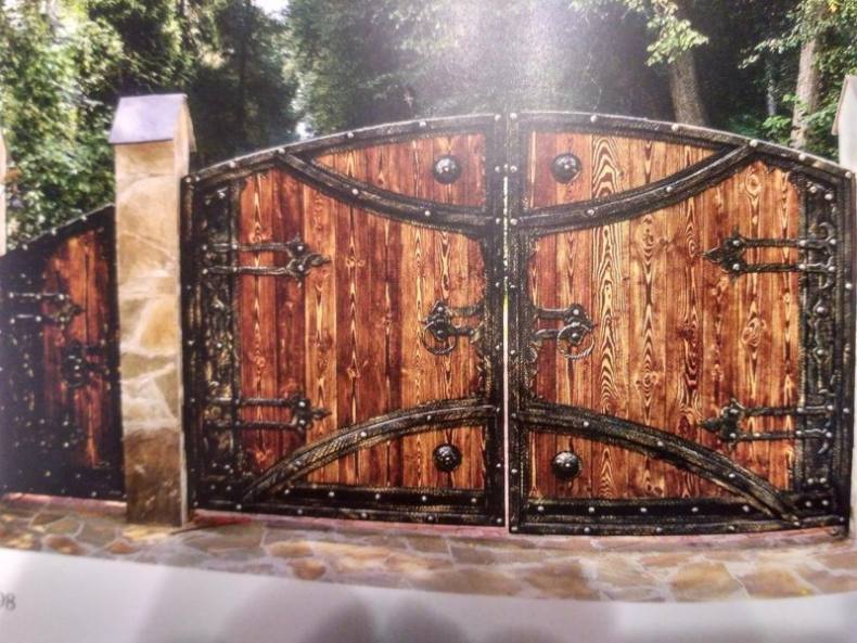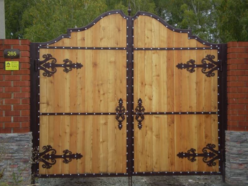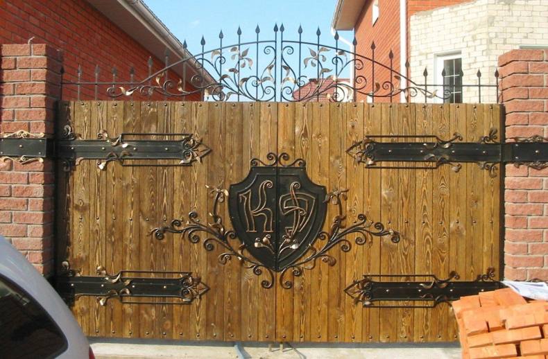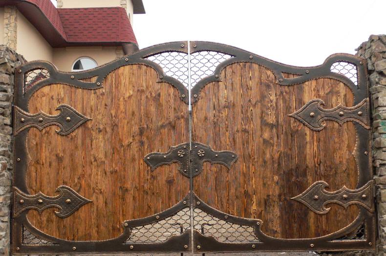 - Отделка элементами ковки. Сочетание дерева и кованого металла придаёт воротам солидный вид. Даже небольшие кованые элементы – засовы, ручки, петли – послужат достойным дополнением к общему виду.