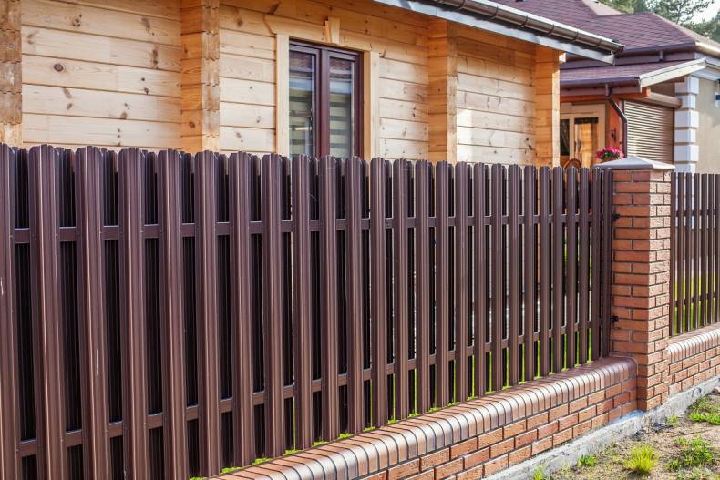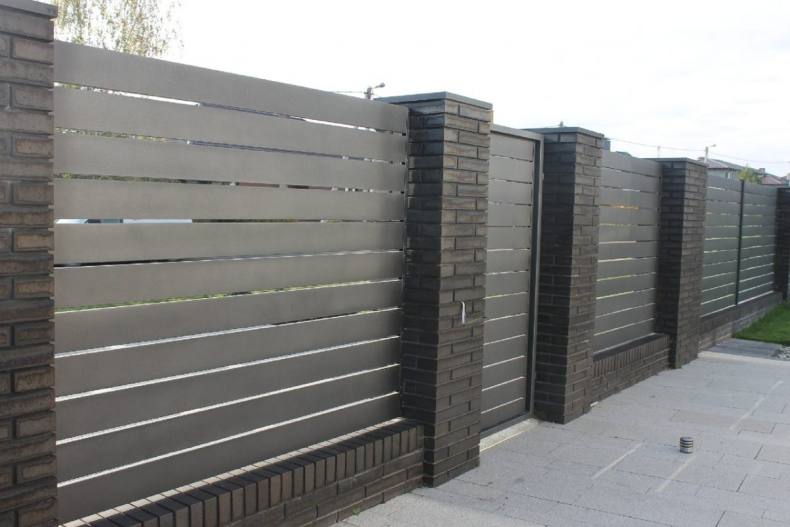- Для прочности забора металлический штакетник комбинируют с кирпичом или камнем.