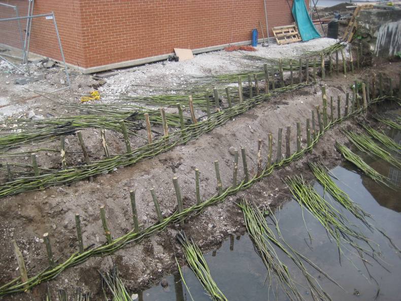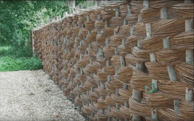 Прутья в определенном порядке огибают опоры. Чтобы ветки хорошо прилегали, их нужно время от времени уплотнять.