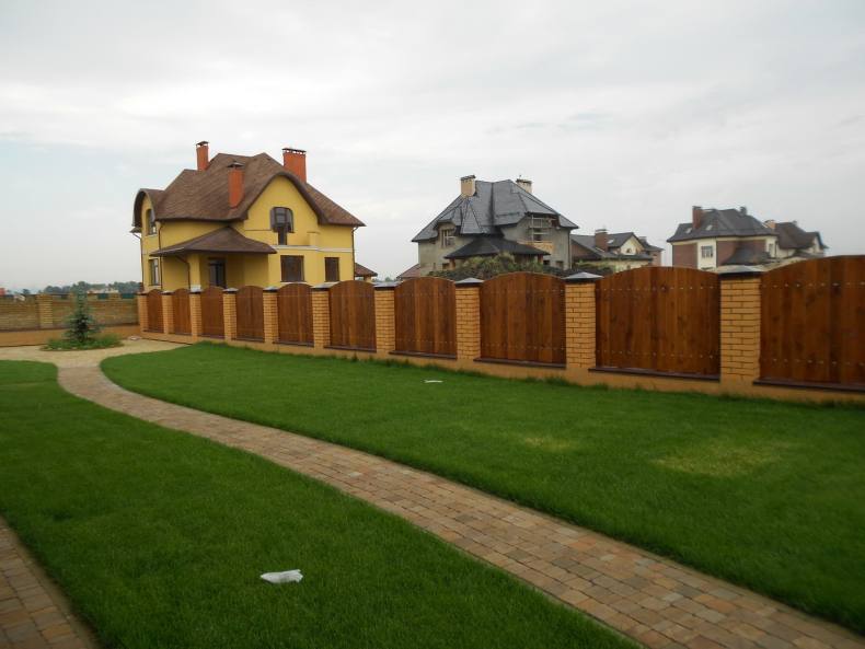 - Участок вокруг дома, построенного из кирпича, лучше всего будет смотреться, обнесенный подобным забором.