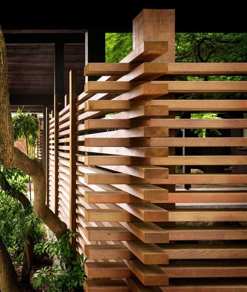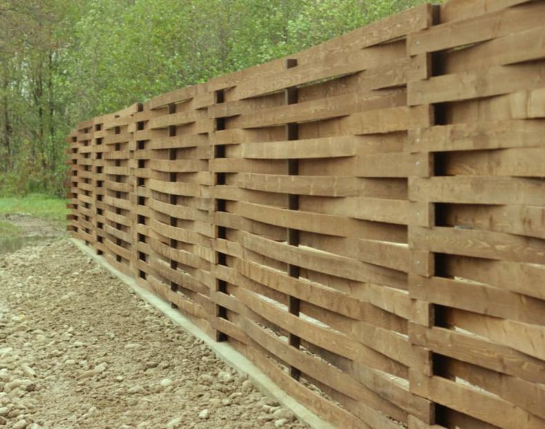 Уже упоминалась, поскольку является, по сути, горизонтальной реализацией штакетника, где каждая горизонтальная планка располагается внахлест, относительно предыдущей, и все они закрепляются на опорном столбе под углом, напоминая лесенку.