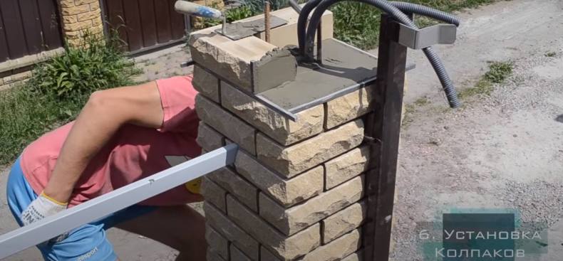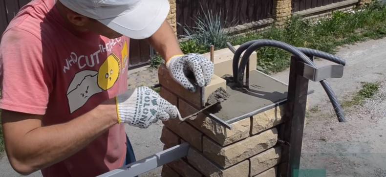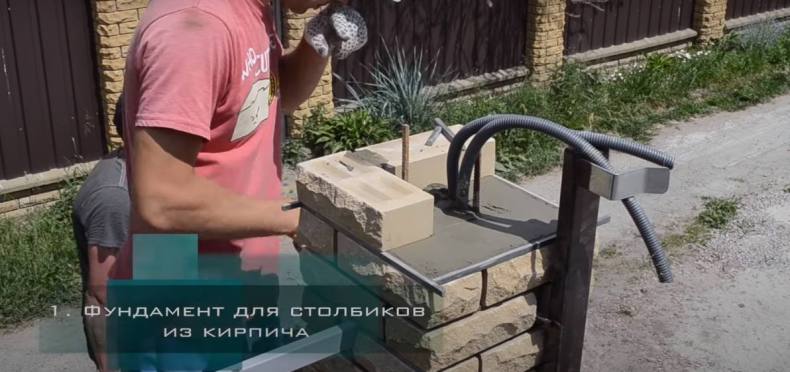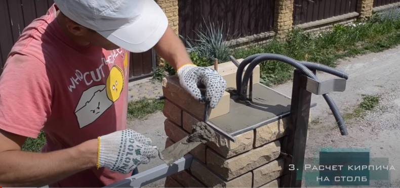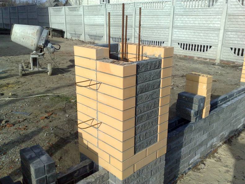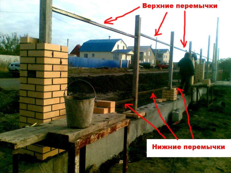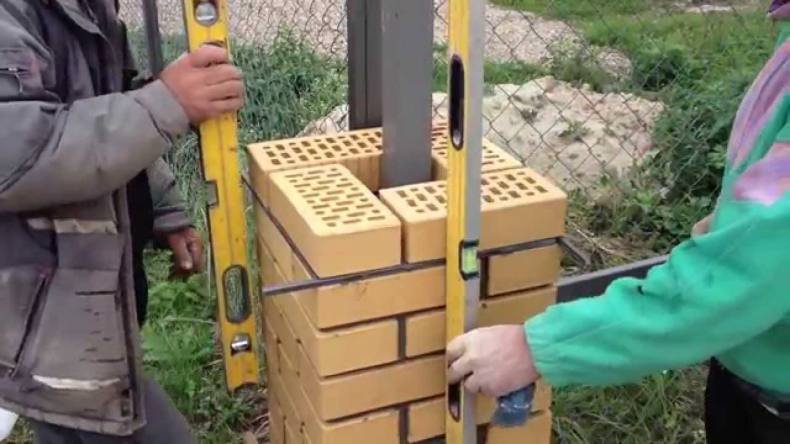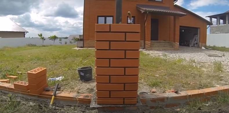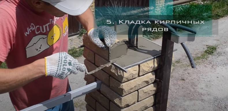 При возведении столбов применяется кладка в 1,5-2 кирпича (вокруг металлической трубы), пустое пространство колодезной кладки заполняется раствором.