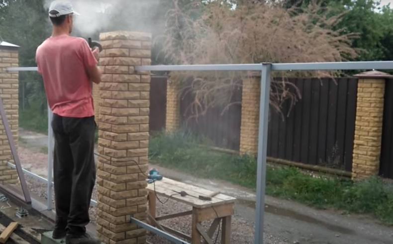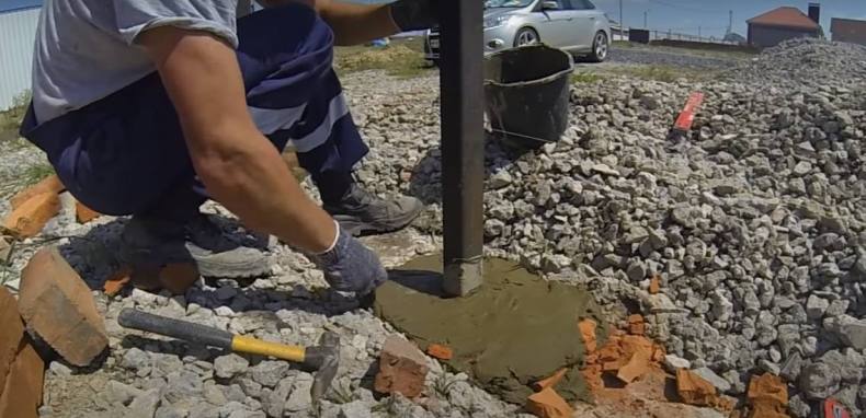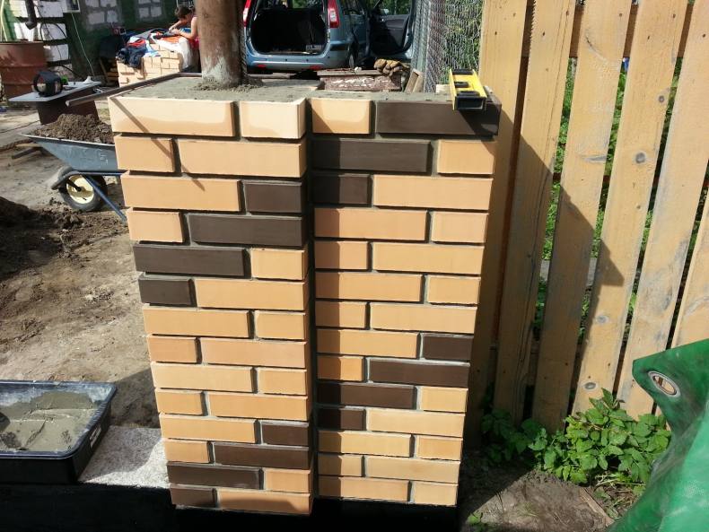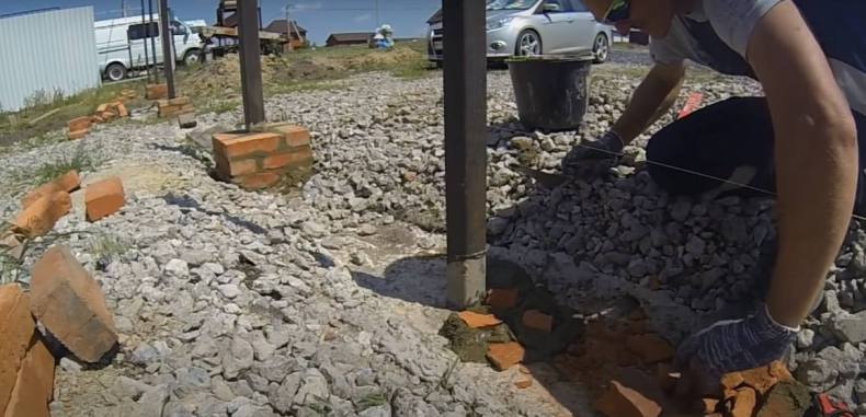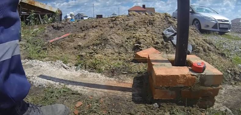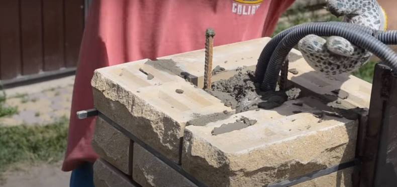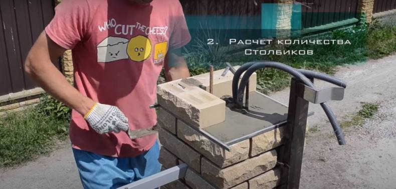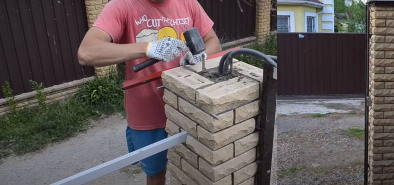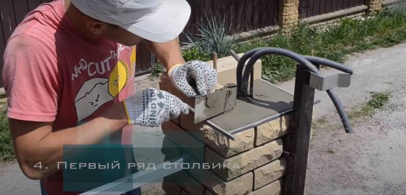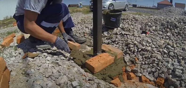 При возведении столбов применяется кладка в 1,5-2 кирпича (вокруг металлической трубы), пустое пространство колодезной кладки заполняется раствором.
