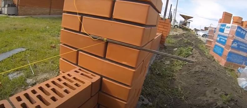 После возведения столбов принимаются за кладку пролетов. Для регулировки толщины вертикального шва первый ряд рекомендуется разложить «всухую». В дальнейшем шаблон швов применяется при заполнении пролета кирпичом.