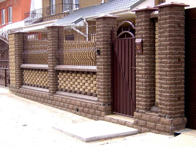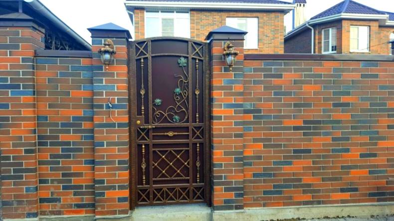 Интересный вариант, бюджетный по стоимости, но сочетание прочного кирпича с металлическим штакетником имеет ряд преимуществ.
