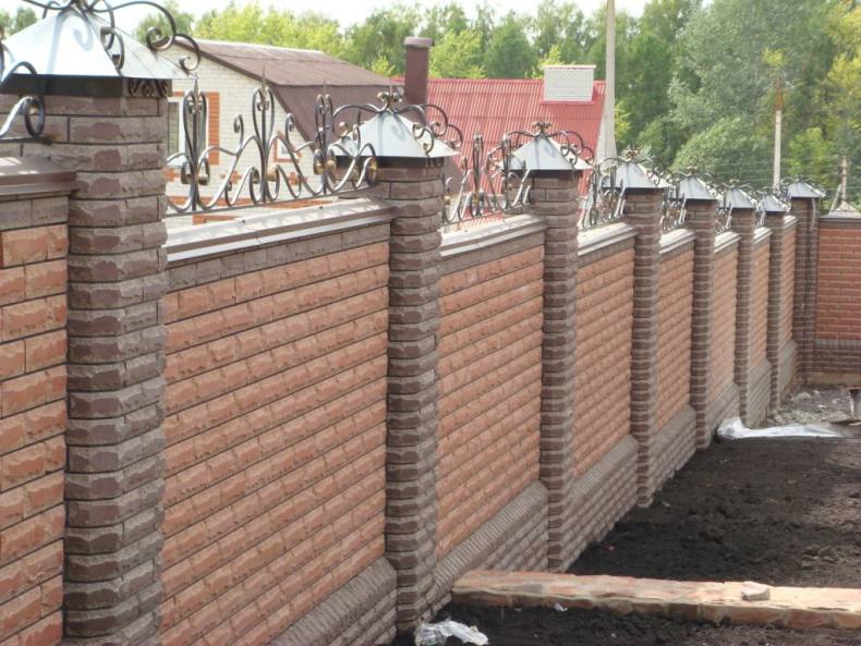 - Прочность и надежность. Забор из кирпича является самым надежным в плане защиты участка, имея максимальную устойчивость к различным механическим воздействиям. Например, кованые ограждения также обладают достаточной прочностью, но их можно преодолеть, к тому же, они прозрачны, поэтому не в полной мере защищают от посторонних взглядов. Сплошной забор из профнастила не дает возможности просматривать участок, но толщина оцинкованного листа значительно уступает кирпичной кладке.