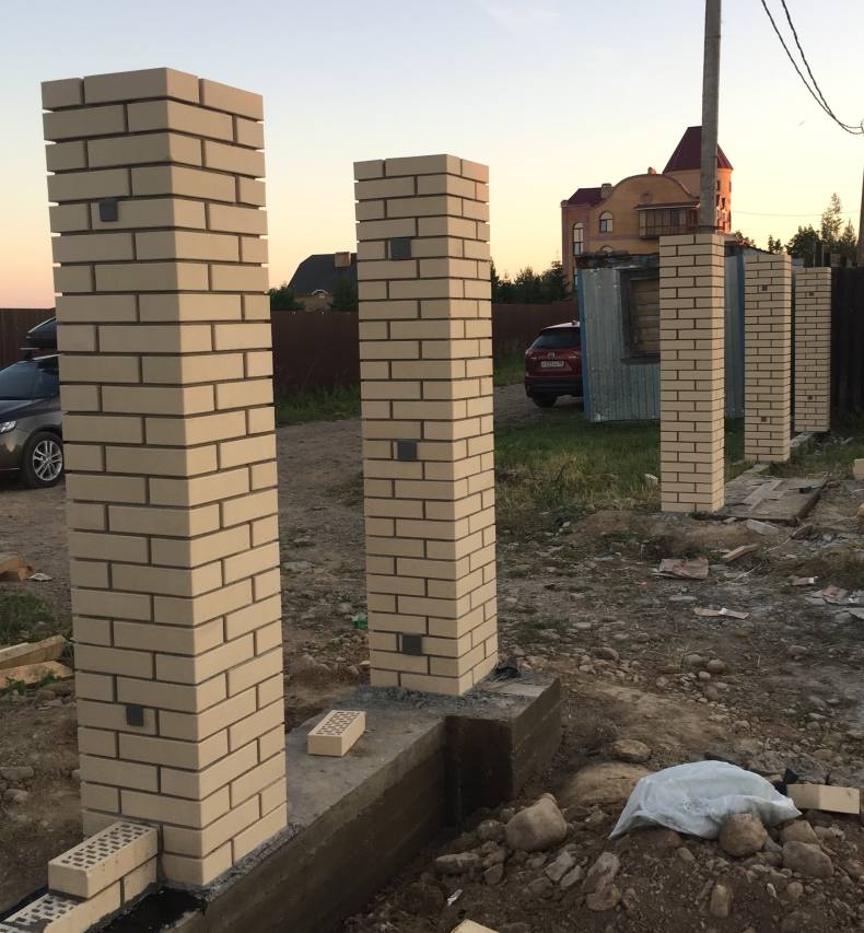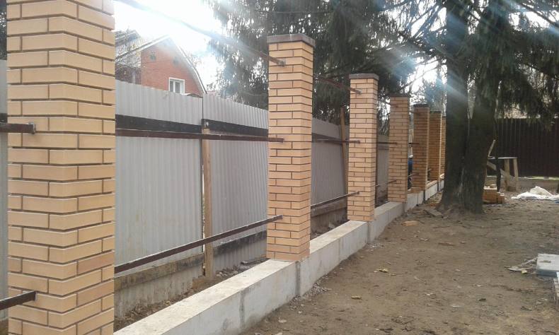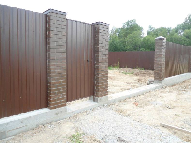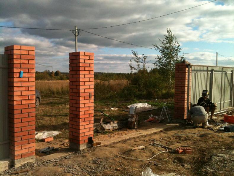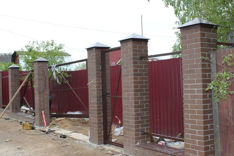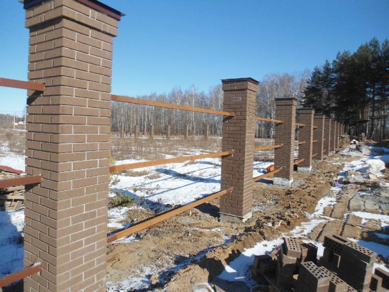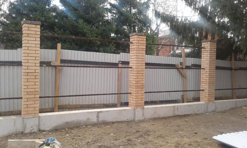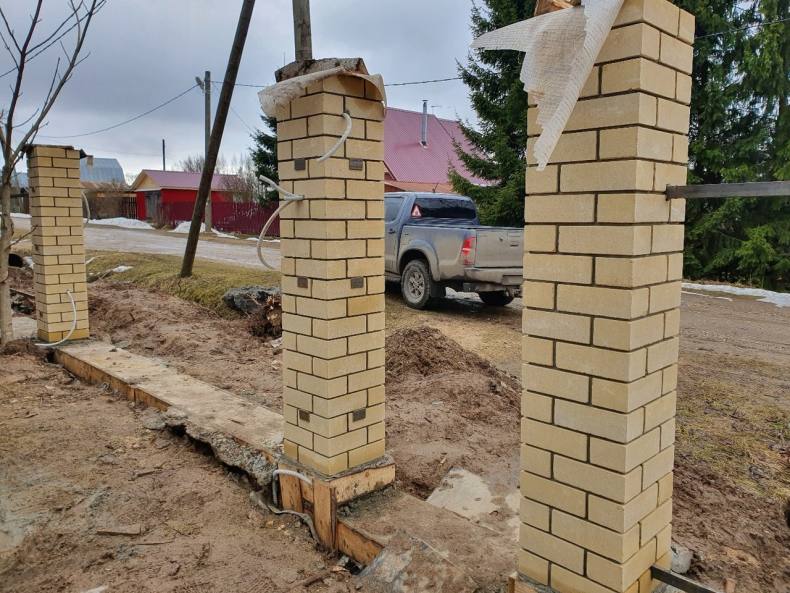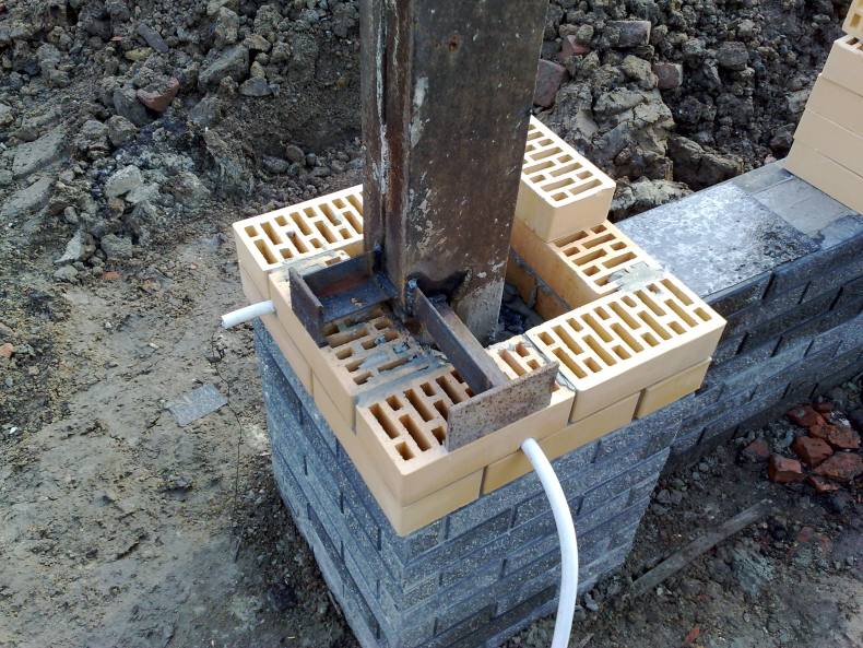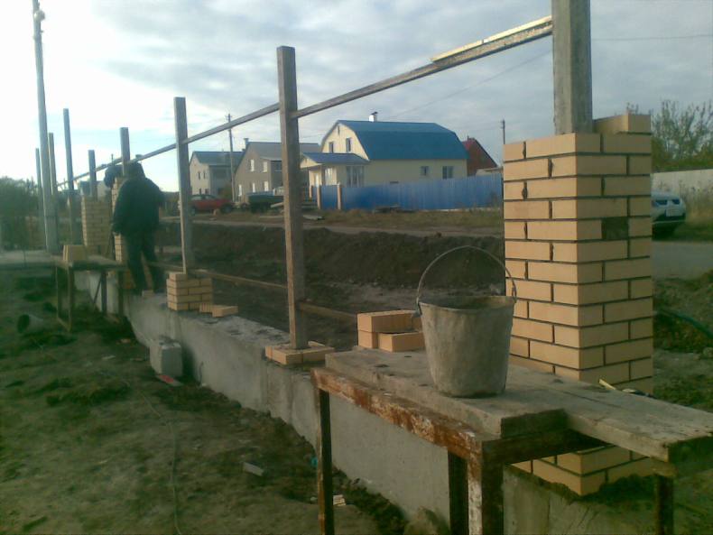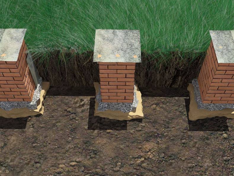Опорные столбы заглубляют в грунт не менее 0,8 м. Возводят опору из кирпича, шлакоблока с последующим соединением опор между собой бетонными перемычками. Опору с кирпичной кладкой обязательно соединяют металлическим прутом.