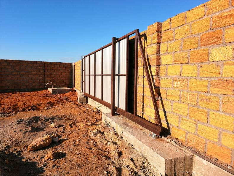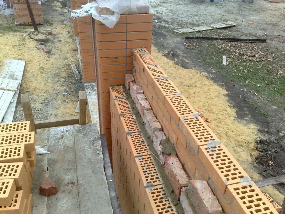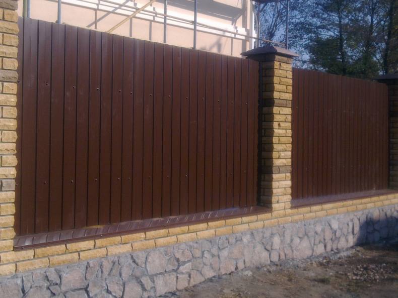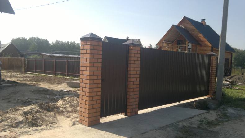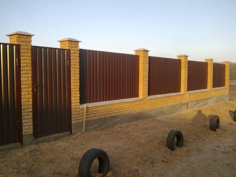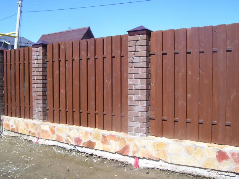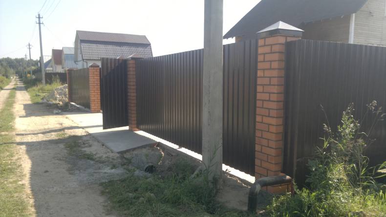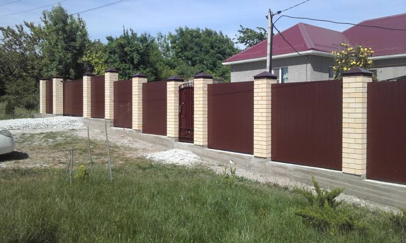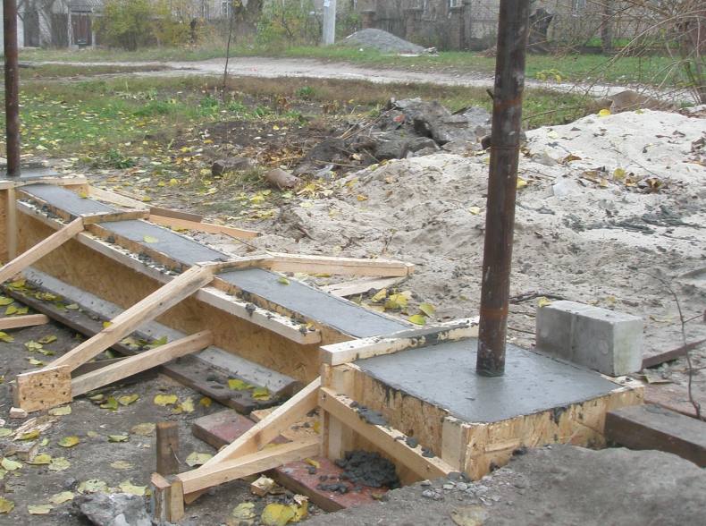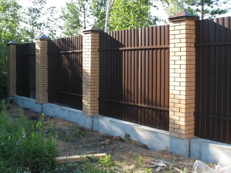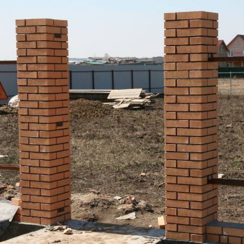 Опорные столбы заглубляют в грунт не менее 0,8 м. Возводят опору из кирпича, шлакоблока с последующим соединением опор между собой бетонными перемычками. Опору с кирпичной кладкой обязательно соединяют металлическим прутом.