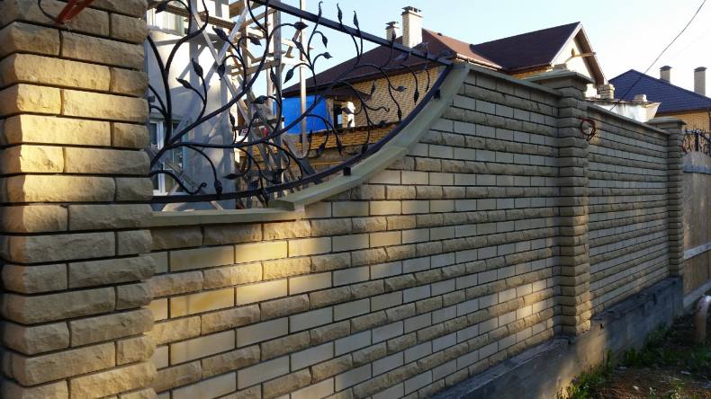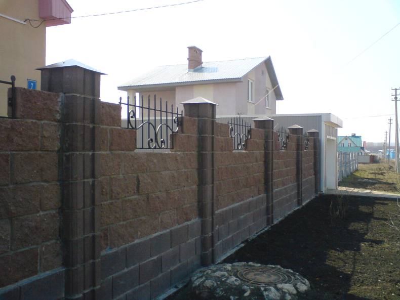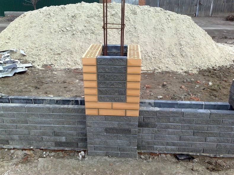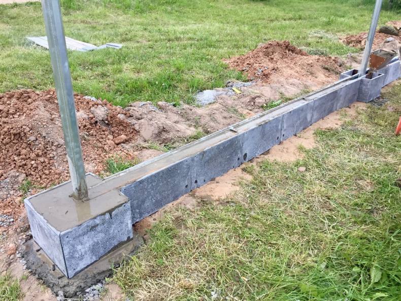 Также в качестве ростверка используют готовые железобетонные блоки. Применяют при возведении кирпичного ограждения с декорированием пролетов легкими отделочными материалами.