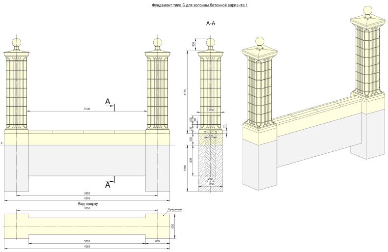 Ширина устанавливается исходя из размера опорных столбов с учетом выступа 2,5-5 см с каждой стороны. Ширина между опорными столбами рассчитывается исходя из наличия и материала декоративной отделки. При ее отсутствии исходят из ширины кирпича с учетом обязательного выступа 2-3 см.