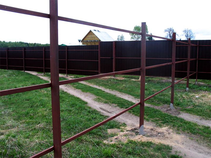 После этого можно приступать к строительству. Определив место и выполнив разметку, формируют опоры под будущий забор. От того, из какого материала они будут сделаны, зависит способ крепления профлиста.