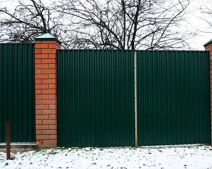 - Для секционного забора. Расстояние между опорами равно общей (если секция – это один лист) или полезной (если секция – 1,5-2 листа) ширине листа профнастила.