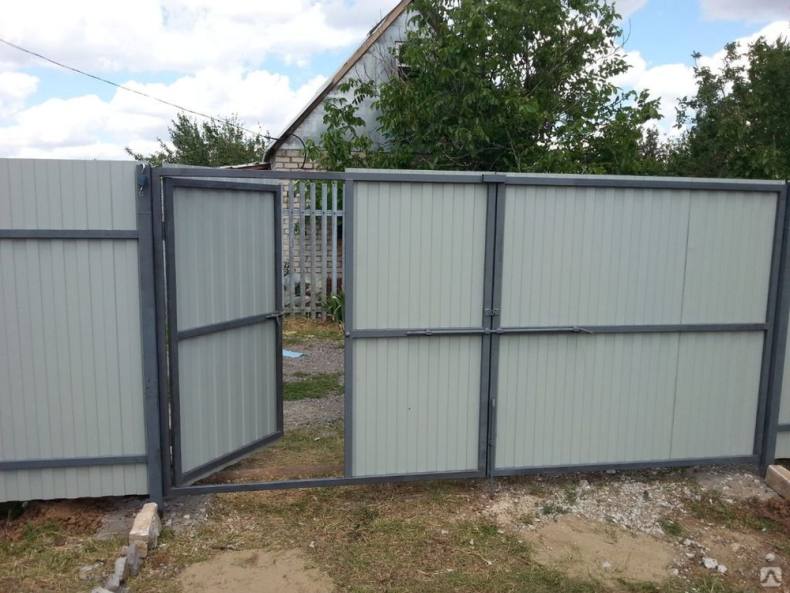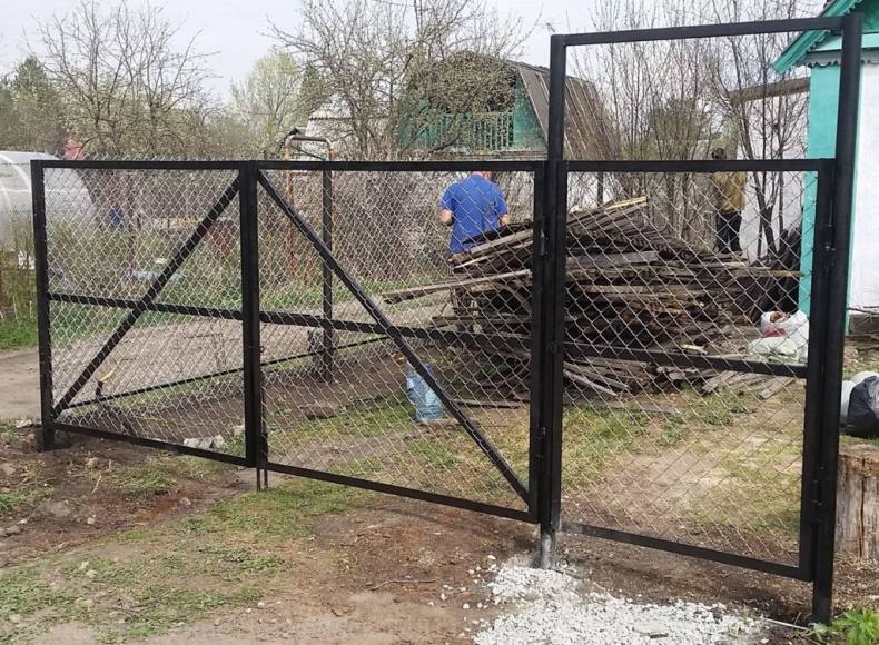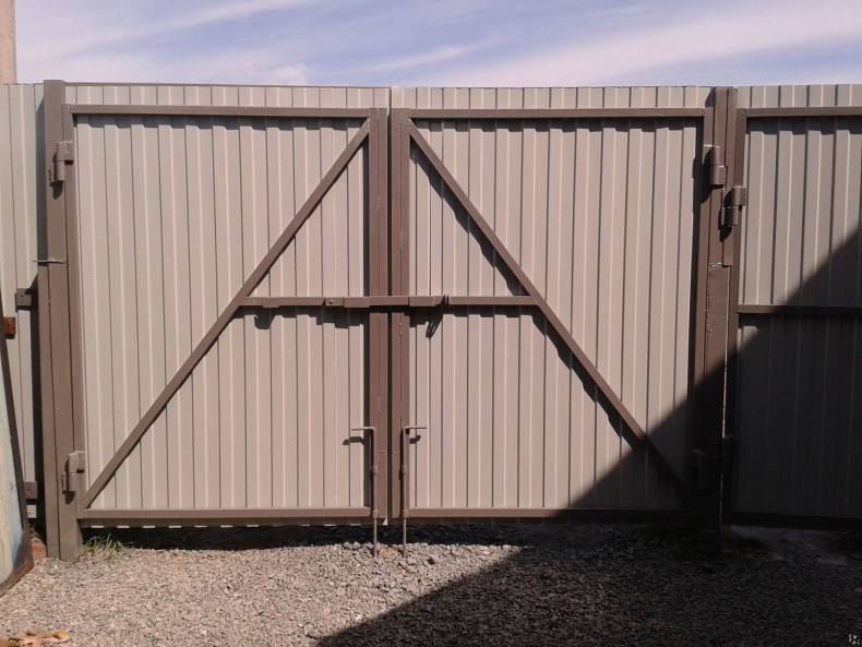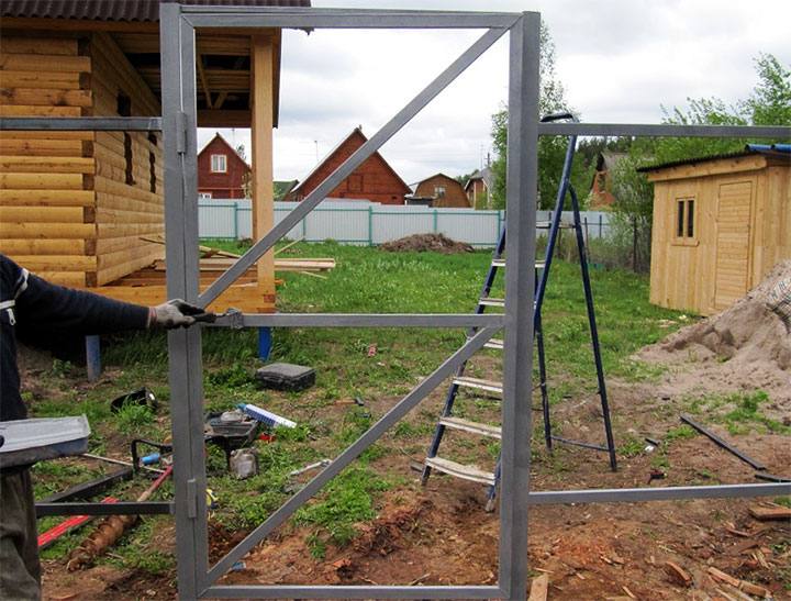 Одним из универсальных вариантов создания каркаса можно считать изготовление каркаса из профильной трубы. Благодаря плоскому металлическому основанию на него можно без особых проблем прикрепить дверное полотно из любого материала (дерево, металл, профнастил, шифер, сетка и другие).