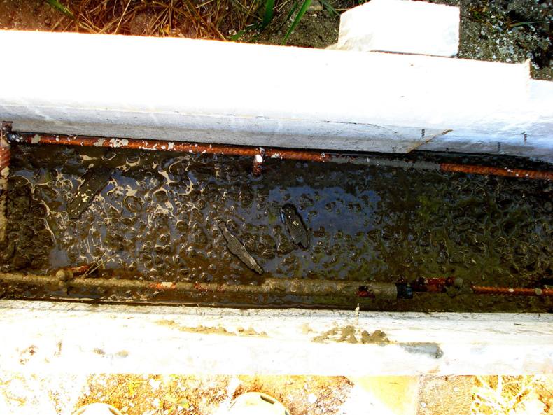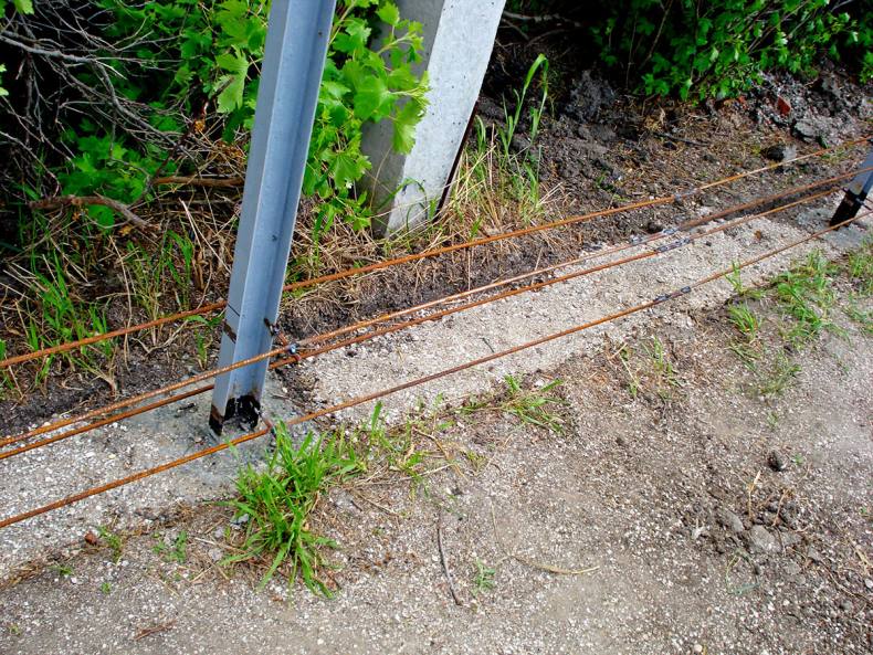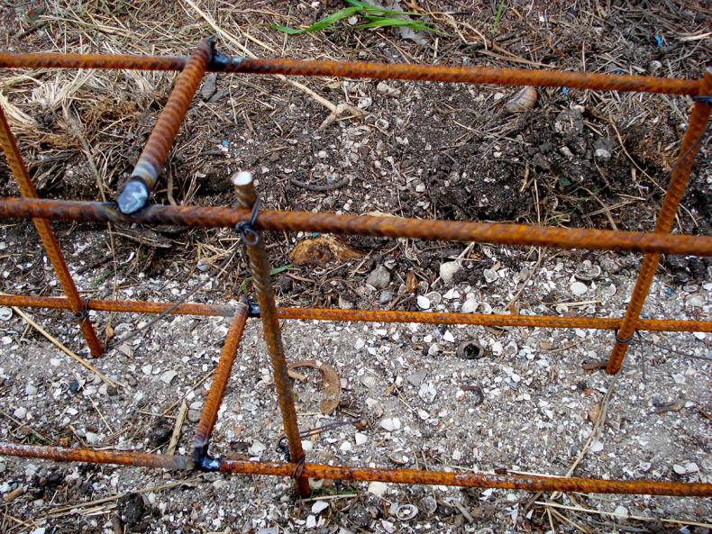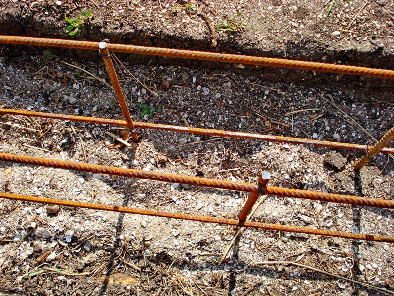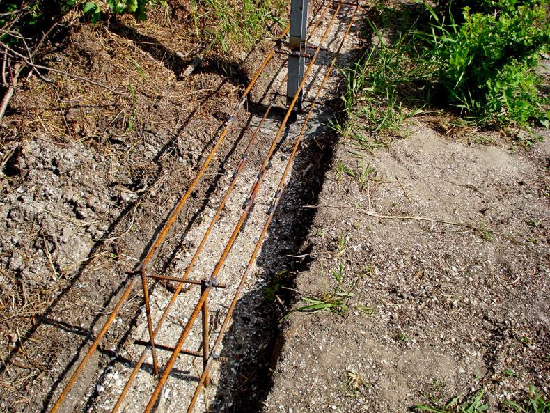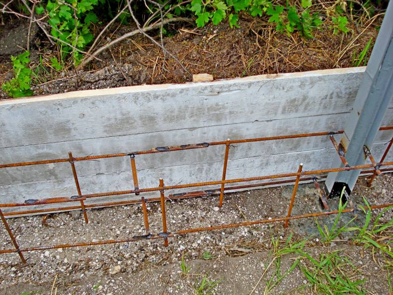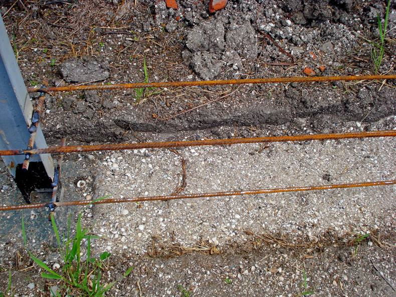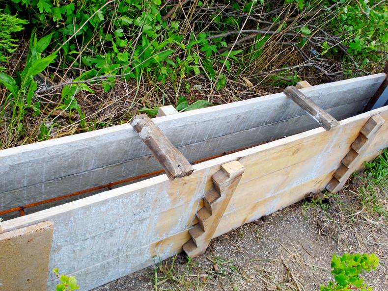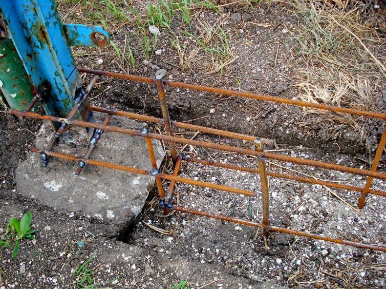 - С помощью арматуры и опалубки место заливается бетоном со столбами на высоту не более 40 см над землей и полметра в глубину.