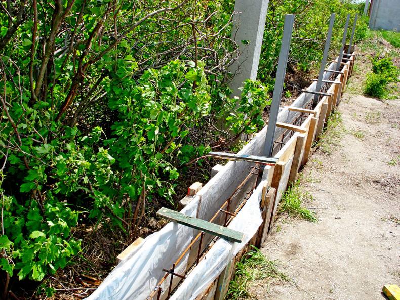 Фундамент для забора может быть сделан по-другому. По периметру выкапывается канава как для строительства ленточного фундамента под дом.