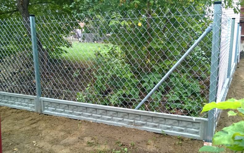 Между столбами должно быть не больше 2 м. Длину столба рассчитывают, исходя из параметров рулона, верхней (без рабицы) и нижней (закопанной) частей.