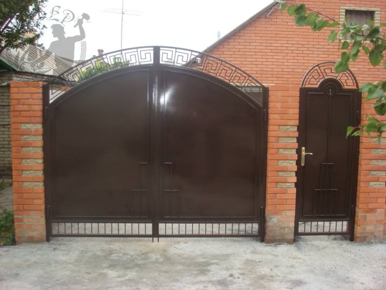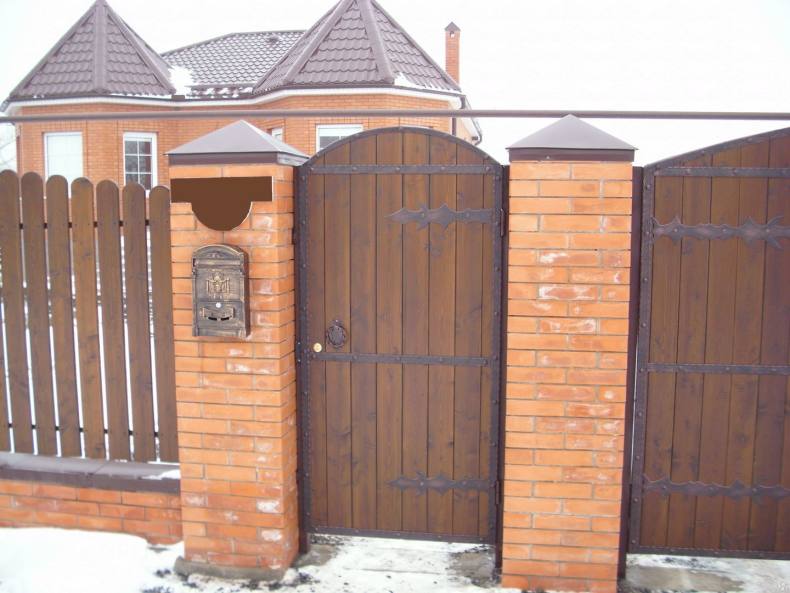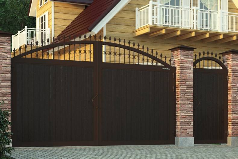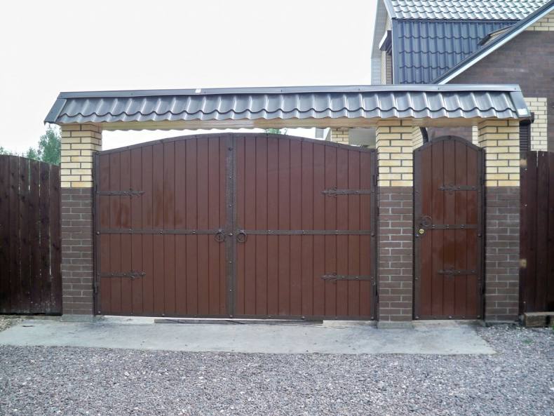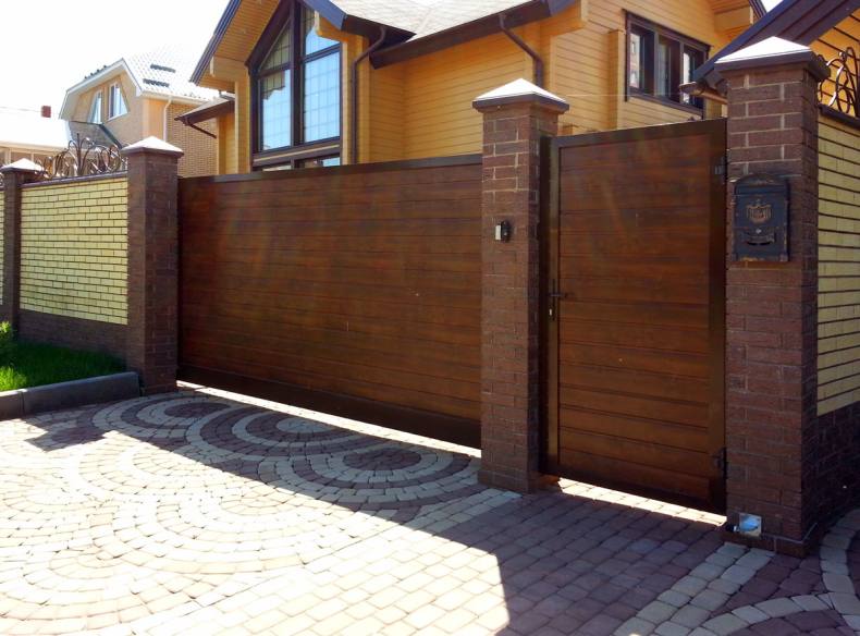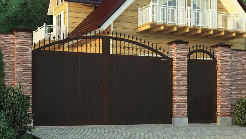 Открывается калитка расположенная сразу рядом с воротами. Если живете в холодном регионе с выпадением большого количества снега, следует отказаться такого проектирования. Нужно понимать, что дополнительное время пойдет на очистку внутренней территории от снега.