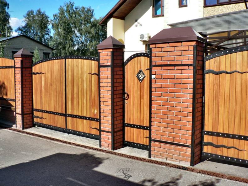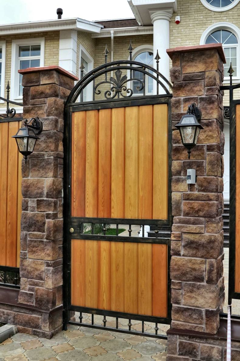 Много проектов, модных сочетаний калитки с различными деталями. Так прекрасно смотрится деревянная калитка с каменным забором. В металлических воротах, прекрасно впишется калитки с такого же материала.
