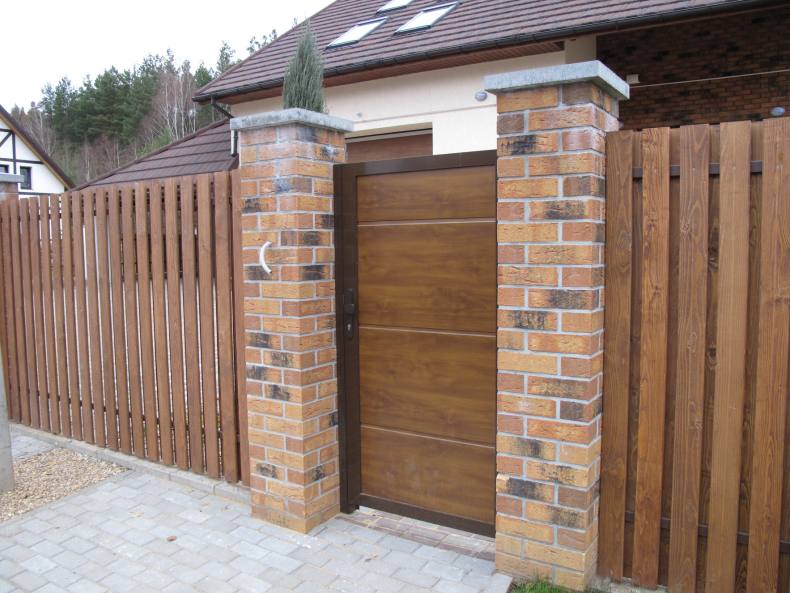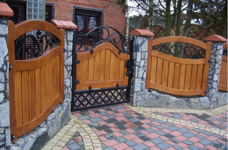 - Деревянная калитка, отлично сочетается с кирпичом, натуральными и искусственными камнями. Дерево, это всегда экологический и чистый продукт. Обработка и установка дерева, стоит абсолютно недорого. Монтаж и установку можно также делать самому. Нюансы: дерево быстро воспламеняется. Не долговечно, подвержено перепадам погоды. Требует специальной обработки морилкой или другими антисептиками для предотвращения гнили, появления жучков.