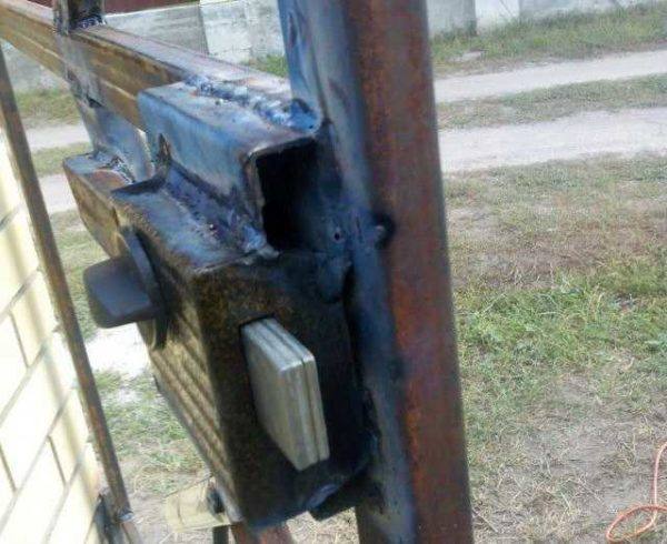 После полного монтажа необходимо зафиксировать замочную коробку, если она врезная. Если же замок навесной, то нужно приварить навесы.