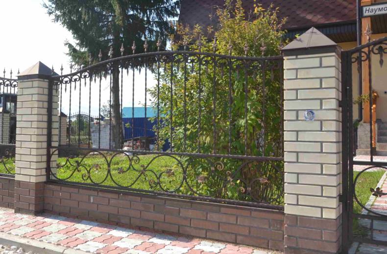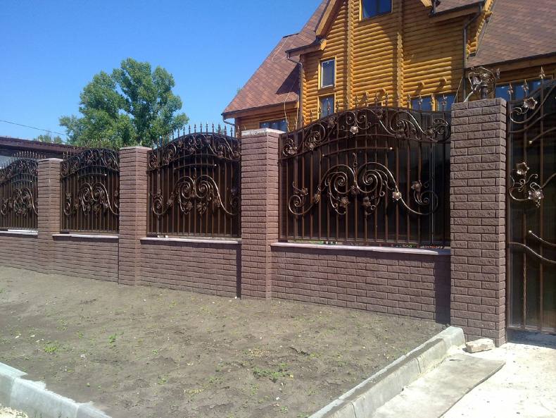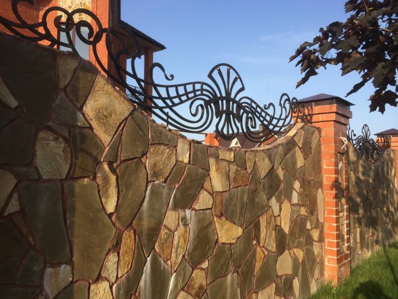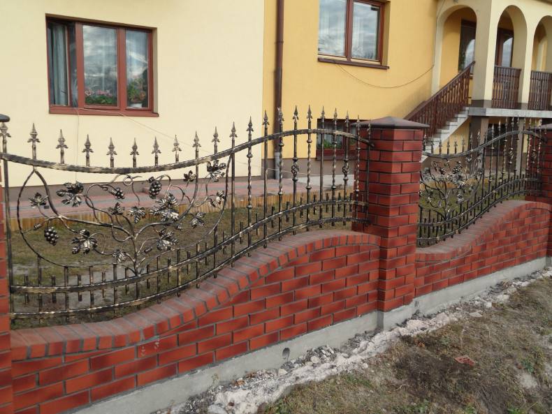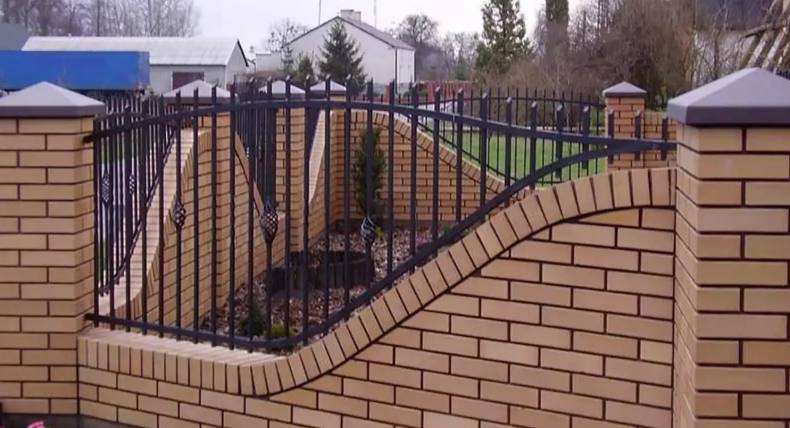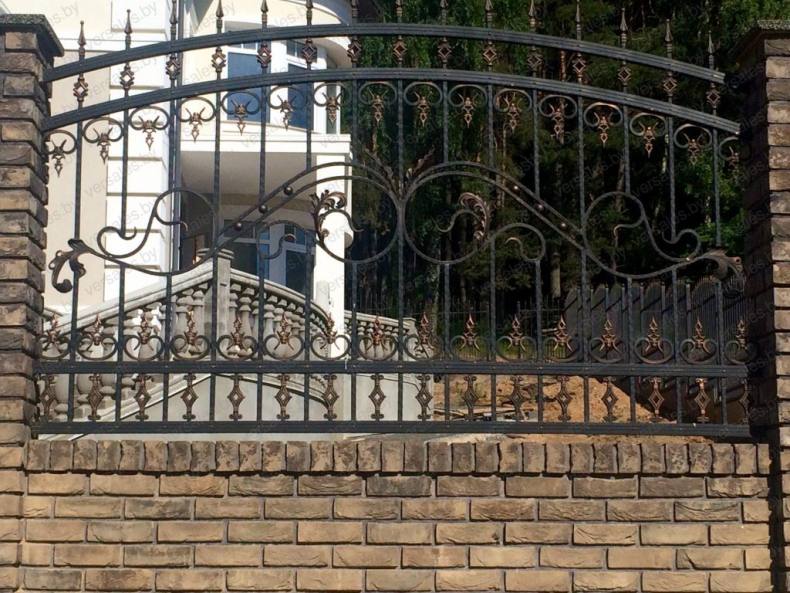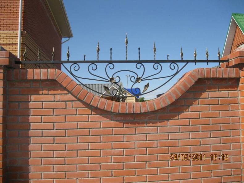 Строение с полукруглой ковкой считается творческой разновидностью забора. Низ заграждения, высотой примерно 1,5 м, выполнен из натурального камня. Между столбами расположены пролёты, выполненные полукругом с коваными элементами. Выкладывание кирпича происходит при помощи специального инструмента для резки.