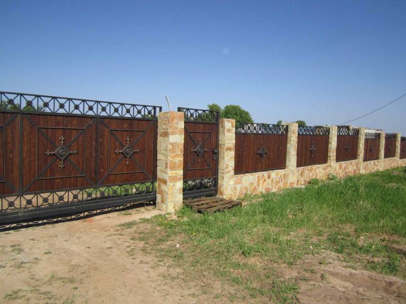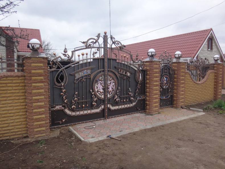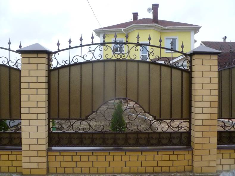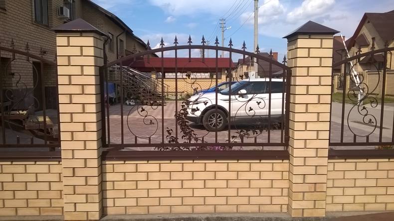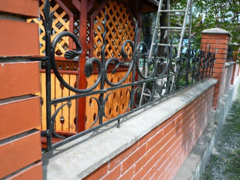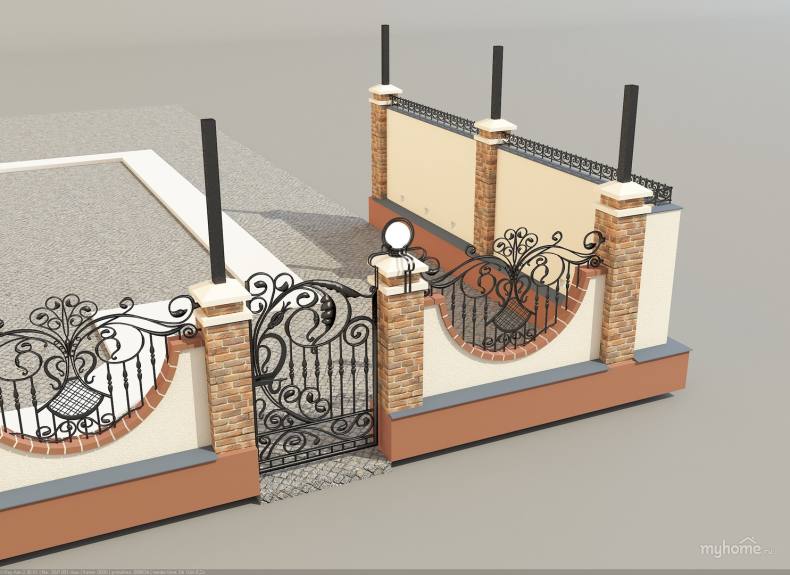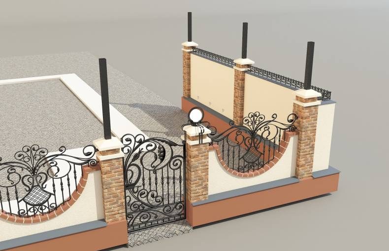 Строение с полукруглой ковкой считается творческой разновидностью забора. Низ заграждения, высотой примерно 1,5 м, выполнен из натурального камня. Между столбами расположены пролёты, выполненные полукругом с коваными элементами. Выкладывание кирпича происходит при помощи специального инструмента для резки.