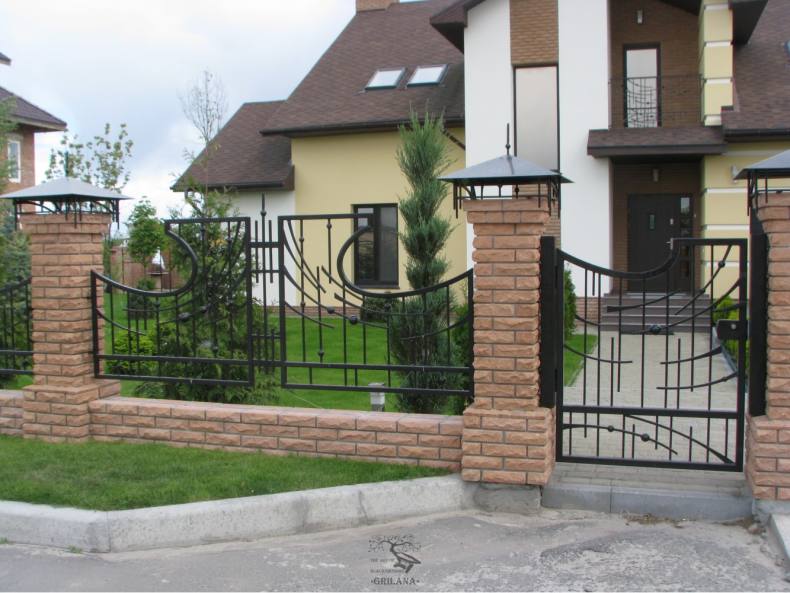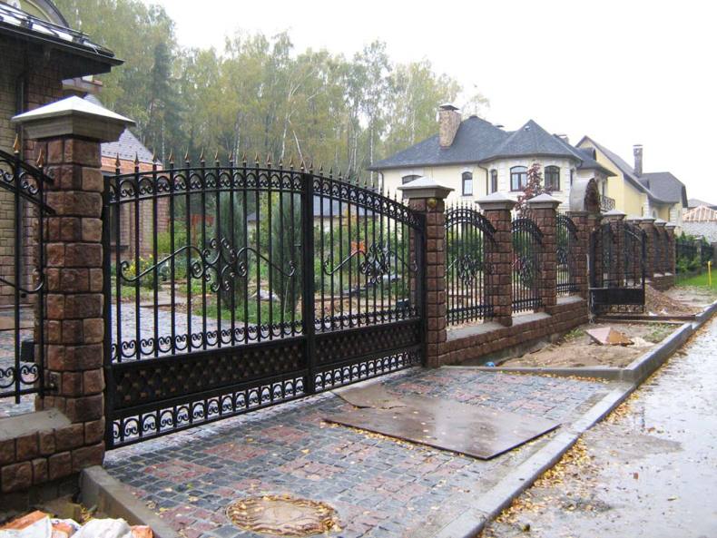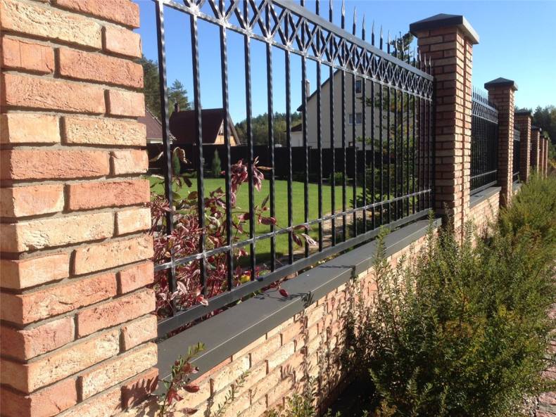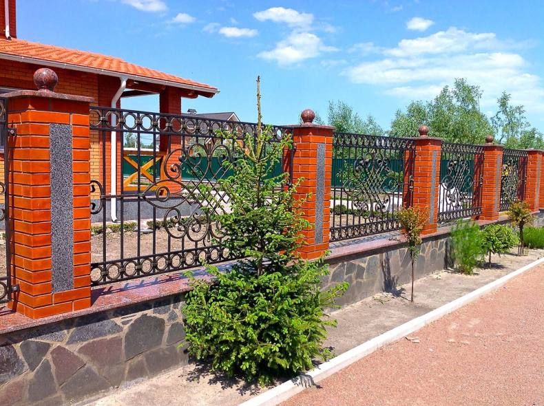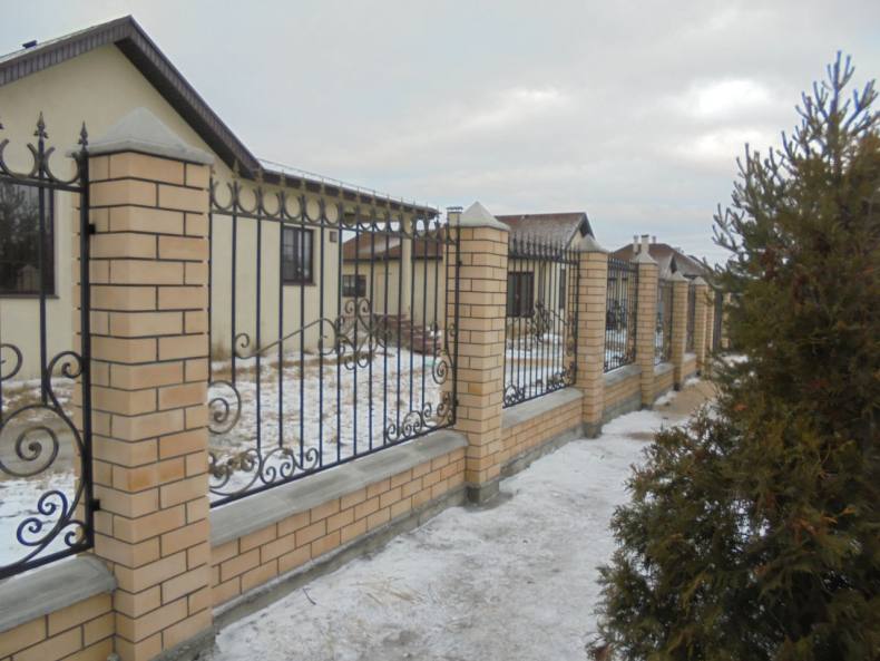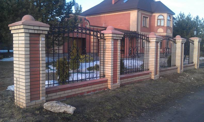 Ограда из кирпича с кованными элементами – это строение с соотношением материалов 50 на 50.