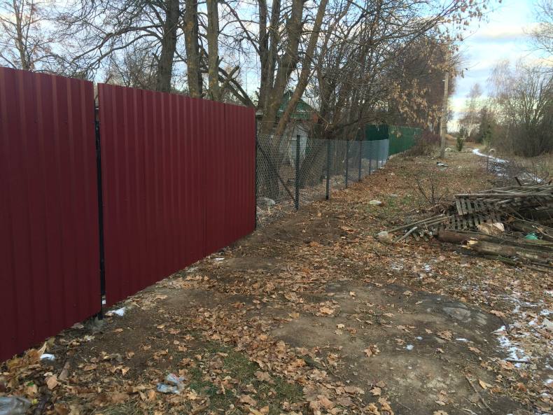 - Например, забор, отделяющий фасад дома от проезжей улицы, можно закрыть, непроницаемым для взглядов, металлическим профнастилом, а остальные стороны участка достаточно оградить сеткой.