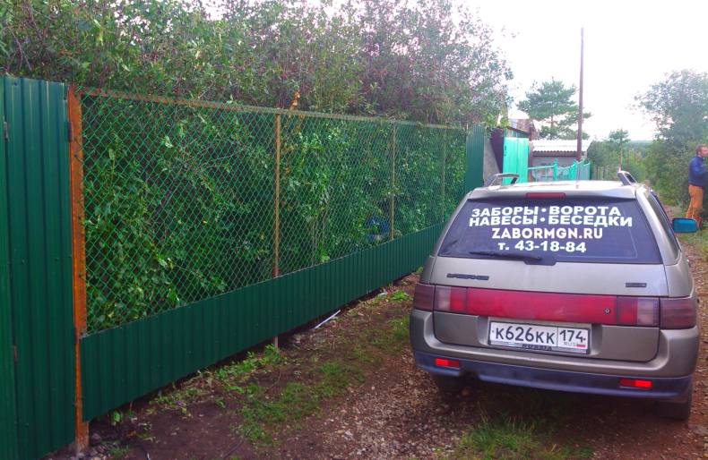 Монтаж забора начинается с установки металлических столбов, к которым крепятся секции из профнастила, соединенные с сетчатыми рамами с помощью винтов.