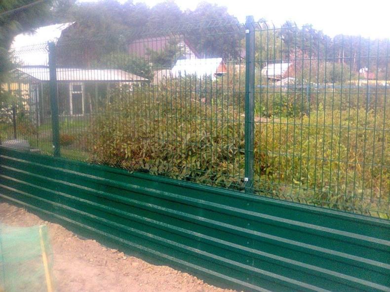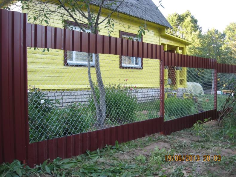 - Повсеместно появляется все больше заборов из комбинации профилированных металлических листов с каменной кладкой или вставками из сетки.