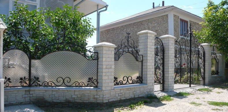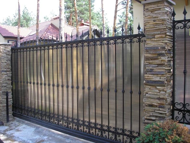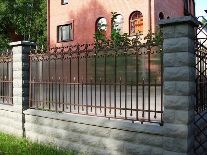 При обустройстве каменных ограждений, каркас оформляется при помощи камня, а сама изгородь с применением поликарбоната. В качестве основных элементов декорирования используются кованные элементы. Использование такого элемента возможно в течении длительного периода, благодаря хорошим показателям прочности.