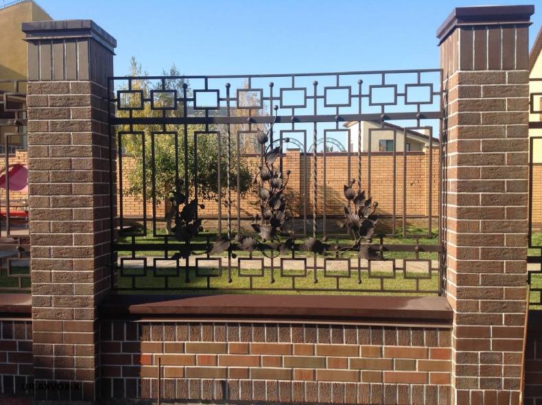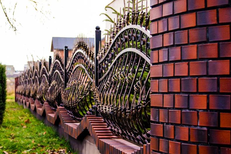 Кирпичный забор красив сам по себе, но если хочется усилить эстетическую составляющую, то можно использовать кованую решетку, деревянные или металлические вставки, растения.