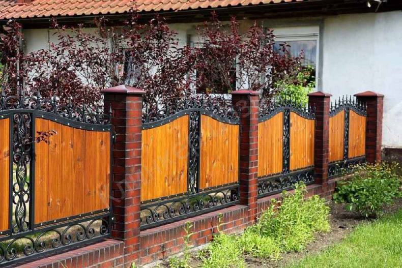 - Деревом, когда столбы возводятся из кирпича, а пролеты делаются из штакетника, деревянной решетки или досок. Этот вариант позволяет совместить в себе красоту природных материалов и прочность кирпичного основания.
